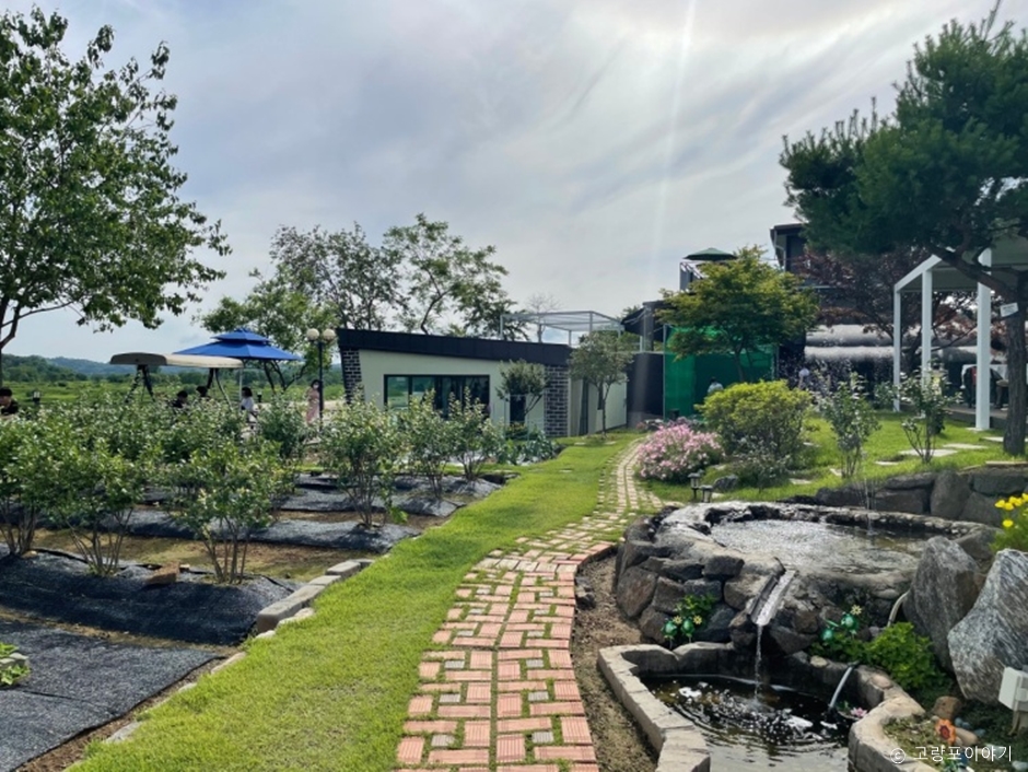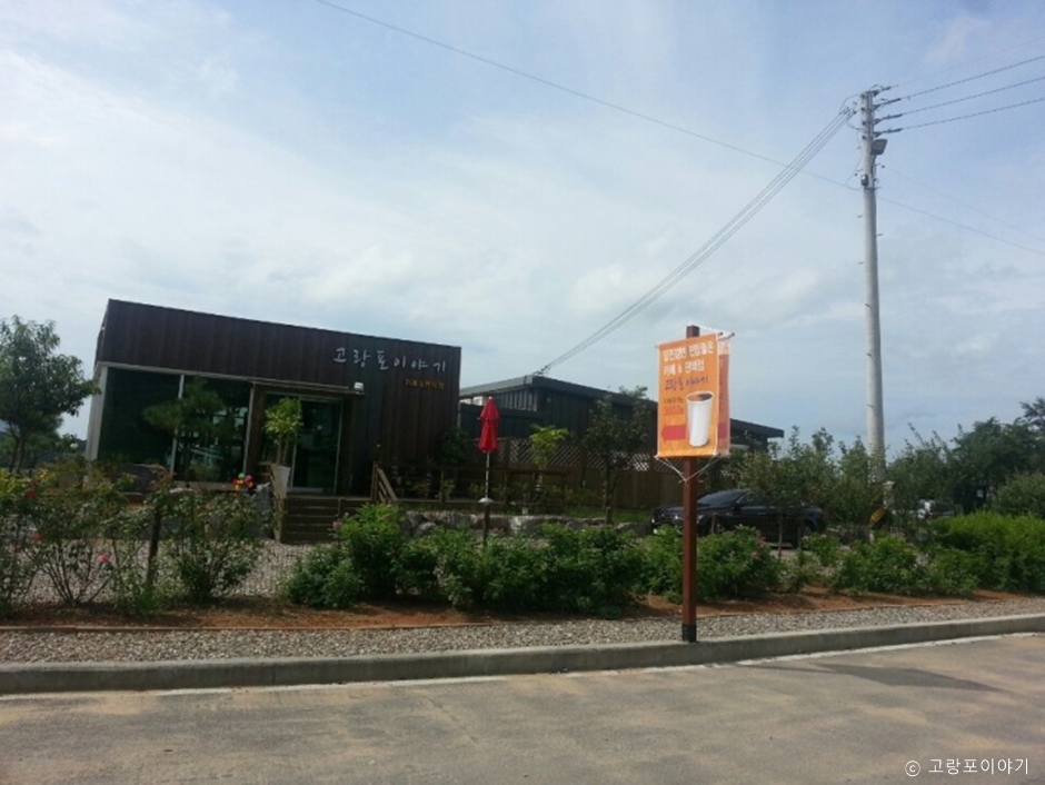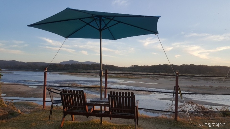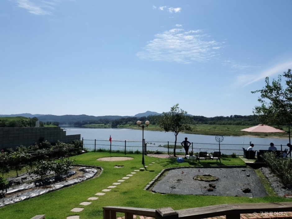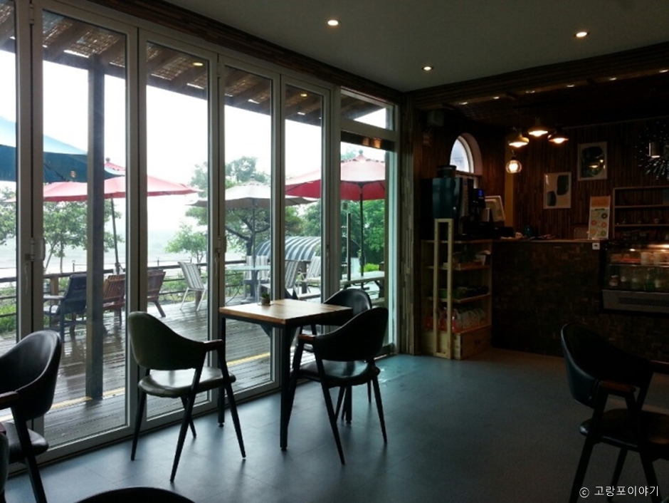 고랑포이야기는 고랑포구의 역사 및 안보 체험을 할 수 있는 연천 고랑포구 역사공원과 연천을 대표하는 고구려 3대 성 중 하나인 연천 호로고루의 중간에 있는 카페이다. 카페 입구에 들어서면 카운터를 지나 넓은 정원이 펼쳐진다. 작은 분수와 텃밭을 중심으로 강변을 따라 설치한 야외 테라스 등이 조성된 아름다운 정원이 있다. 야외 테라스 테이블에서는 임진강을 가까이서 조망할 수 있고 연천 호로고루도 한눈에 들어온다. 정원 한쪽으로는 조그마한 골프 연습장이 있다. 골프 연습장 쪽에도 실내 공간이 추가로 있다. 이곳은 공간도 널찍하고 테이블도 넉넉하여 훨씬 편안한 환경이다. 날이 좋지 않은 날에는 이곳 실내에서 임진강을 조망할 수도 있다.?