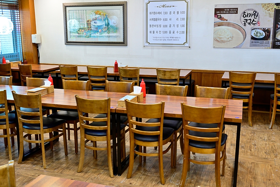 하가원 해운대점은 좌동재래시장 안에 있는 콩국수와 수제비를 판매하는 한식당이다. 대표 메뉴는 강원도에서 직접 재배한 콩으로 만든 사계절 즐길 수 있는 콩국수이다. 국수 위에 고명을 올리지 않는 게 특징인데, 오히려 콩국의 진한 맛을 느낄 수 있다. 수제비 역시 이곳의 또 다른 대표메뉴이다. 그 외에도 해물파전, 돌판 비빔밥, 왕만두 등 다양한 메뉴가 준비되어 있어 취향에 맞게 선택해 즐길 수 있다. 가게 매장이 넓고 주차는 매장 앞에 할 수 있지만 주차를 할 수 있는 공간이 많지 않아 인근 공영주차장을 이용하는 것을 추천한다. 가게 주변으로 해운대수목원, 동백섬 해안산책로 등이 인접해 있어 함께 둘러보기 좋다.
