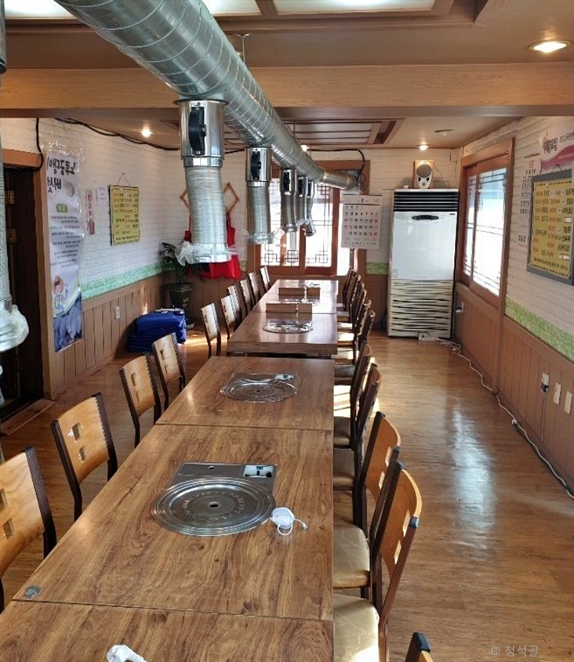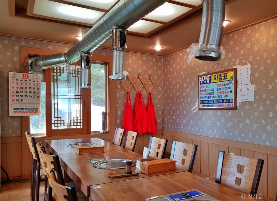 청석골은 고급진 여주쌀로 밥을 지으며, 메인 메뉴와 계절에 맞는 제철 나물로 이루어진 한식 한상이 차려지는 곳이다. 대표메뉴는 쑥의 향긋한 향을 가득히 품은 시골 쑥전이다. 메인 메뉴를 주문하면 식전 메뉴로 생버섯과 소금참기름장이 나온다. 직접 짠 참기름 장에 찍어 먹는 버섯 맛이 입맛을 돋운다. 또, 삼겹살을 주문하면 주인이 직접 키운 버섯을 함께 내주고 리필도 가능하다. 제육볶음은 가브리살로 고기를 도톰하게 썰어서 양념했다. 잡냄새 없이 부드럽고 매콤 달콤한 양념이 잘 배어있어 맛있다. 더덕무침을 비롯한 다양한 밑반찬은 깔끔하다.