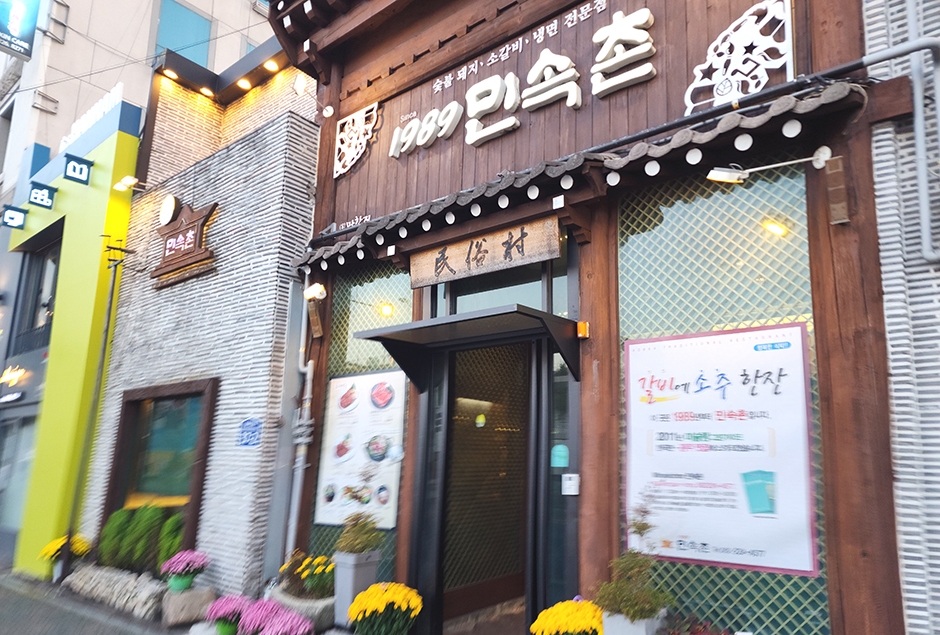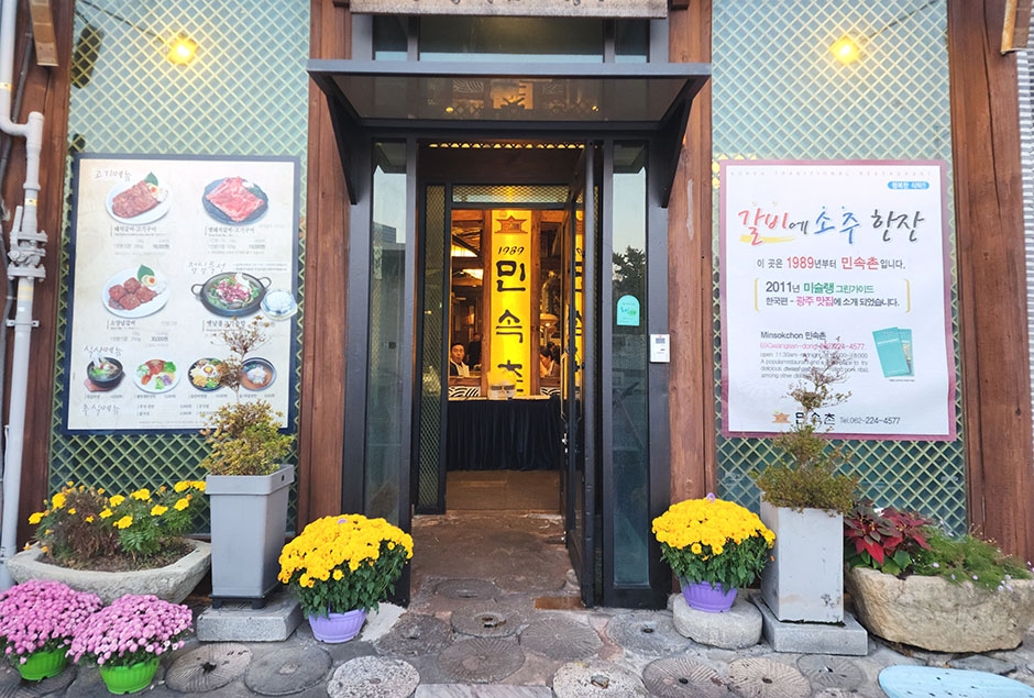 광주 남구문화예술회관과 남부경찰서 사이 큰 사거리에 위치한 민속촌은 주차장이 넓어, 단체모임을 하기에도 적합하다. 평일은 인원수 관계없이 예약할 수 있고 주말에는 6인 이상 예약할 수 있다. 창문 밖으로 가벼운 분수 물줄기가 시원스레 흘러내려 물소리와 함께 아늑한 분위기에서 고기를 즐길 수 있으며 조명으로 기와집 분위기를 내 외관에서 느껴지는 따뜻한 정감이 있다. 홀이 넓고 룸이 개별적으로 마련되어 있어 단체로 회식하거나 가족 모임을 하기 좋다. 남구문화예술회관이 근처에 있어 연계 관광하기 수월하다.