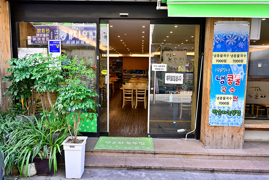 사장님 얼굴을 간판에 걸고 장사하는 곳으로 믿음이 가는 동네 맛집이다. 1987년 7월 700원의 가격으로 시작한 박순자녹두집은 오랜 전통만큼이나 맛과 열정을 자부하는 손수제비집으로 동구 예술가의 거리 부근에 있다. 수제비, 콩나물국밥, 빈대떡, 코다리찜 등의 메뉴를 맛볼 수 있는 한식당으로 미역, 바지락, 계란 등을 넣어 구수하게 끓인 수제비가 특히 인기다. 기본 찬으로는 소량의 두부김치와 겉절이김치, 콩물, 깍두기가 함께 제공된다. 매장 안에는 좌식의 별도 룸도 3곳 있고 나머지는 입식이다. 지산유원지, 동리단길카페거리 등이 주변에 있어 연계 관광하기 수월하다.