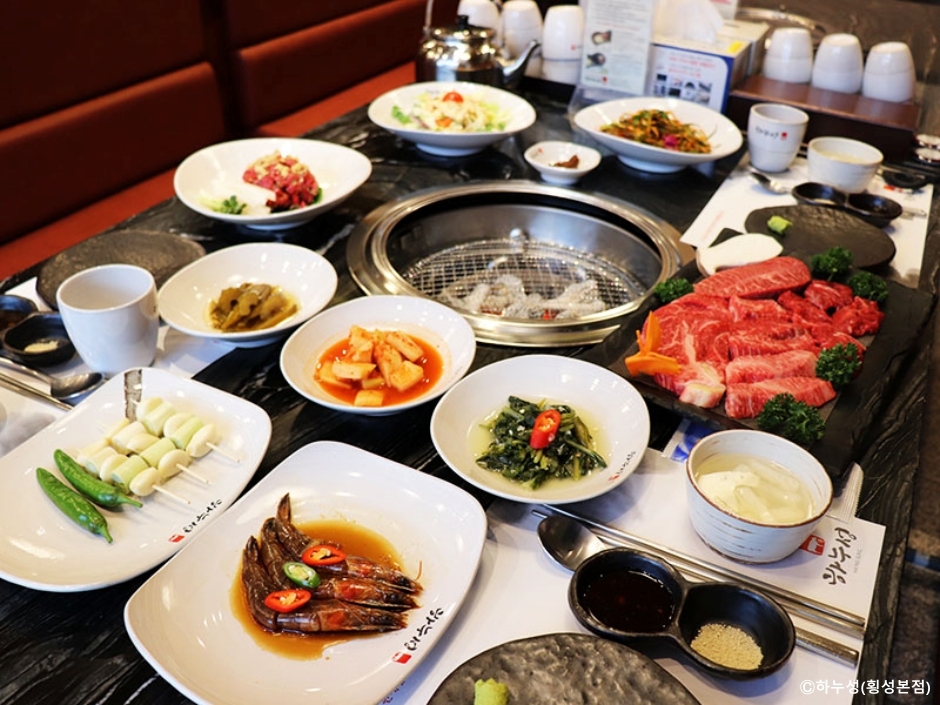하누성 횡성본점은 강원도 횡성군 둔내면에 있는 한우전문점이다. 쇼케이스에 한우를 부위별로 포장해 놓은 것을 보고 골라서 구워 먹을 수 있는 식당이다. 이곳은 한우 투플러스만 취급하는 식당으로 고기의 품질이 매우 좋다. 주변에 둔내스키장도 있고 오크밸리, 웰리힐리 리조트도 있어 가족 동반 손님이나 라운딩을 나온 골퍼들이 많이 방문한다. 고기를 고르고 자리를 잡으면 맛있는 밑반찬과 숯불을 가져온다. 적당한 기름에 육즙이 배어 나오는 고기의 맛이 뛰어나다. 매장에서 먹은 고기는 쇼케이스에서 골라 포장해 갈 수도 있다. 주차는 매장 앞에 전용 주차장이 있어 이용이 편리하다.