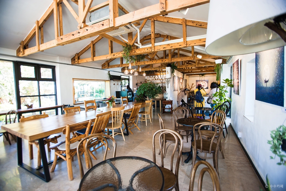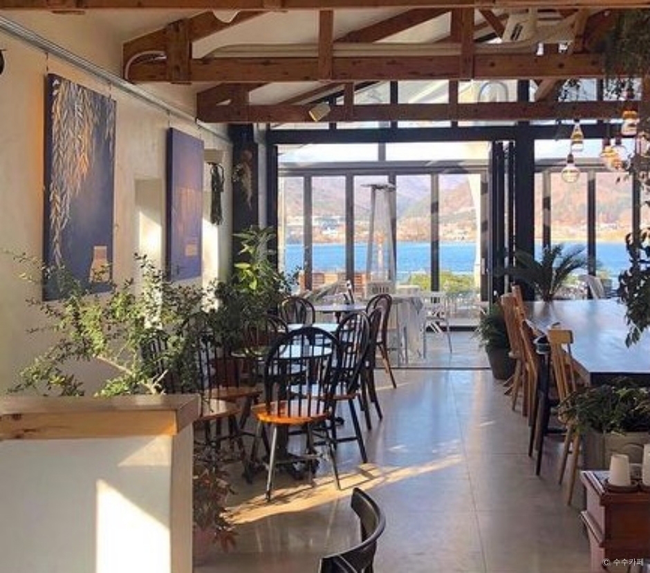 수수카페는 야외 테라스에 앉아 북한강을 바라보면서 데이트를 즐길 수 있는 곳이다. 6·25 전쟁 때 사용하던 야전병원을 활용한 공간으로 넓고 한적한 곳에 자리 잡았단 것도 수수의 장점이다. 아늑한 카페 공간에서 음료와 베이커리를 즐길 수 있고 산책로 따라 걸으면 별도의 별도 공간을 마련해 야외에서 차와 디저트를 즐길 수 있게 배치해 뒀다. 한강이 보이는 여유로운 공간으로 양평이나 두물머리를 찍고 이동한다면 꼭 한번 들려 볼 만하다.