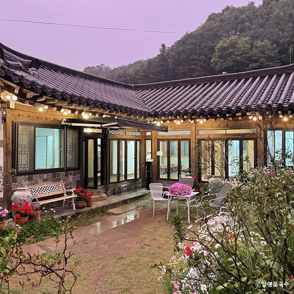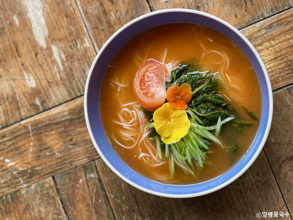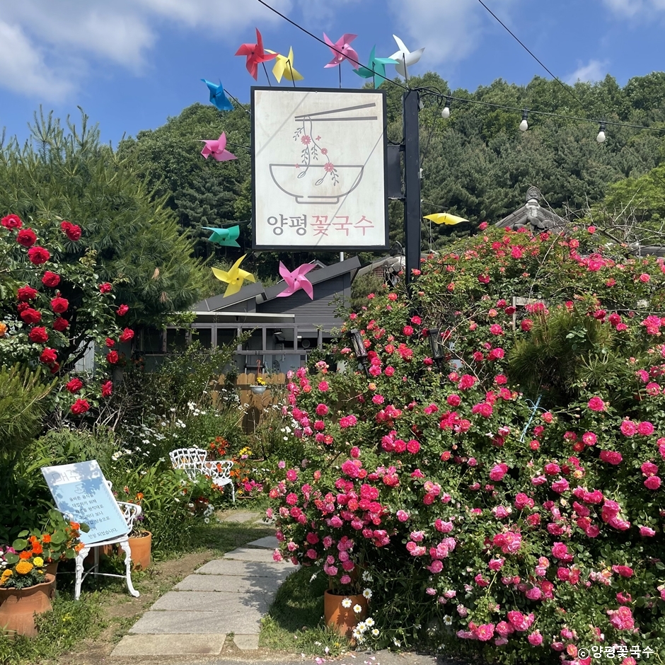 양평꽃국수는 양평군 옥천면 신복리에 있는 국수 전문점이다. 한옥을 개조하여 형형색색 화려한 꽃과 나무들이 배치되어 맛은 기본이고 눈에 들어오는 풍경에 눈길을 빼앗기는 곳이다. 대표 음식인 송이갈비국수에 들어가는 사골 육수는 야채가 듬뿍 들어가 진하면서 시원한 맛이 일품이다. 모두 국수 위에 음식 맛만큼 예쁜 꽃이 올라가 눈이 더욱 즐거운 음식을 제공한다.