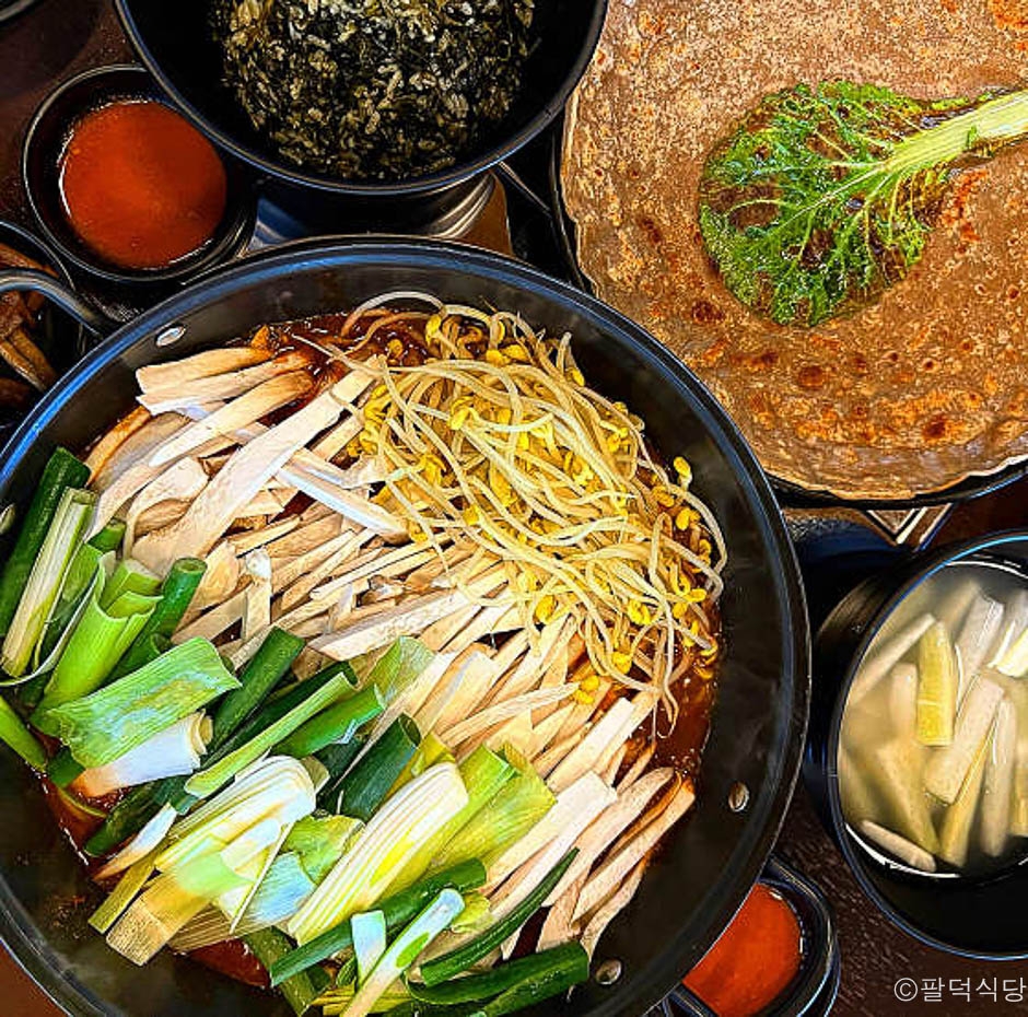 팔덕식당은 매운 등갈비찜 전문점이다. 매장의 외관이 인상적이며, 내부가 넓어서 불을 사용하는 요리에도 공기가 탁하지 않다. 대표 메뉴인 등갈비는 맵기 정도를 선택하여 주문한다. 등갈비가 익을 동안 서비스로 제공되는 큼직하고 고소한 메밀전을 맛볼 수 있다. 소스가 매콤하여 찍어 먹어도 좋고 등갈비를 싸 먹어도 좋다. 잘 익은 등갈비는 육질이 부드럽고 살이 잘 떨어져 먹기 편하다. 사리로는 밀떡이나 쫄면을 선택할 수 있다. 향이 좋은 곤드레밥과 볶음면도 인기다. 팔덕식당 근처에 가볍게 산책할 수 있는 안양 학의천과 학운공원이 있다.