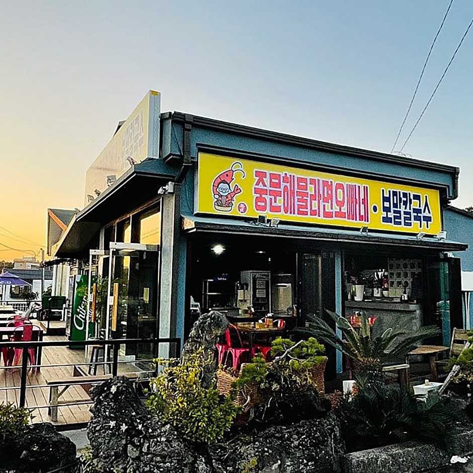 중문해물라면오빠네 본점은 제주 중문관광단지 인근, 예래입구사거리 근처에 자리한 개성 있는 해물라면 전문점이다. 대표 메뉴인 문어해물라면은 일반 라면스프나 캡사이신을 전혀 사용하지 않고, 오빠네만의 수제 비법소스와 신선한 해산물을 듬뿍 넣어 진하고 얼큰한 국물 맛을 자랑한다. 이와 함께 즐기기 좋은 전복치즈밥은 리조또 풍의 부드럽고 고소한 시그니처 메뉴로, 라면과의 조합이 좋다. 그 외에도 제주산 보말과 미역을 사용해 깊은 감칠맛을 더한 전복보말칼국수, 제주 흑돼지로 맛을 낸 든든한 꼬기라면도 이곳만의 특별한 메뉴이다. 인근에는 중문관광단지, 대왕수천예래생태공원 등 제주에서 유명한 관광지가 가까이 있어 여행 중 들르기 좋은 맛집으로 추천한다.