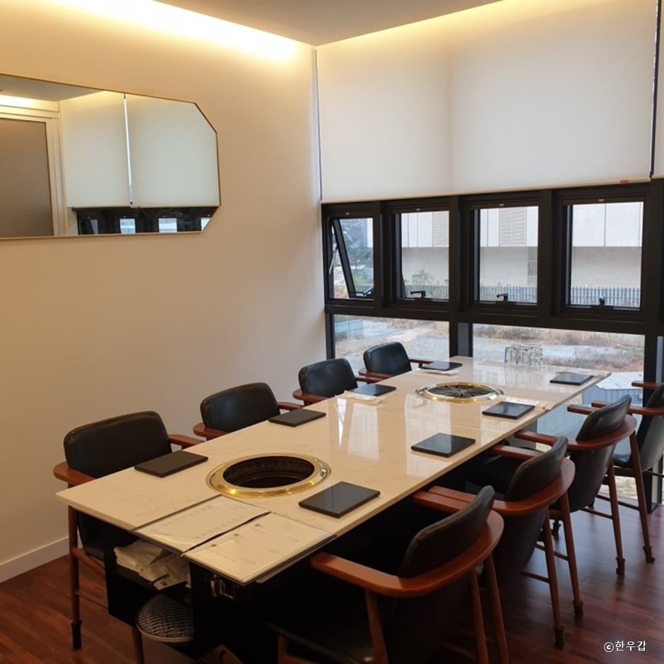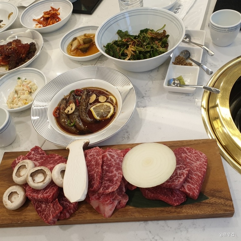 한우갑은 광교신도시 초창기부터 광교에서 성업 중인 한우 전문점이다. 이곳은 최상 1++ 등급의 한우만을 취급한다. 생등심, 치마살, 업진살, 꽃등심, 안심, 살치상, 뭉티기, 한우육회등 다양한 부위 뿐만 아니라 홀 그레인 머스타드 등 다양한 소스로 끊임없이 이어지는 맛의 향연을 제공한다. 그 외에도 칠리새우, 잡채, 연어샐러드, 참나물무침, 콘샐러드 등 기본반찬도 하나하나 정성스레 준비하여 끊임없이 식욕을 자극한다.