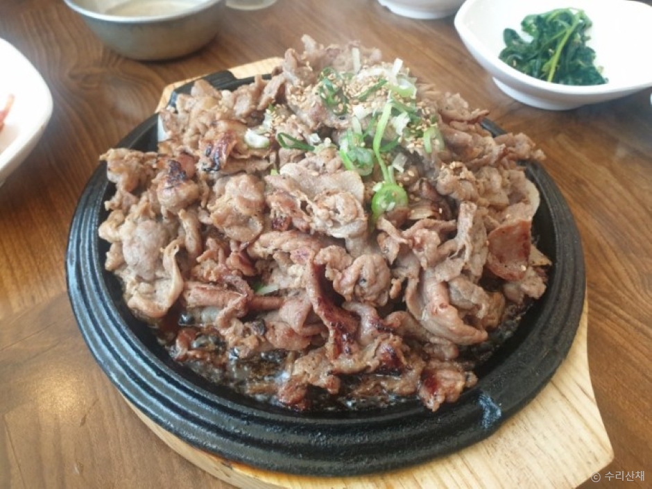 수리산채는 석쇠불고기 쌈밥정식이 맛있는 한식당이다. 석쇠에 참숯으로 구운 석쇠불고기와 찰흑미와 찰기장, 백미의 조화로운 삼색밥과 함께 신선한 쌈채소, 다양한 반찬이 곁들여지는 쌈밥 정식을 전문으로 하고 있다. 식후에는 먹는 누룽지숭늉은 전통가마솥에 끓인 추억의 맛을 느낄 수 있다. 쌈밥정식 외에도 야채와 도토리묵을 함께 무친 도토리묵무침과 우렁이회무침 등이 있어 사이드로 함께 먹을 수 있다.