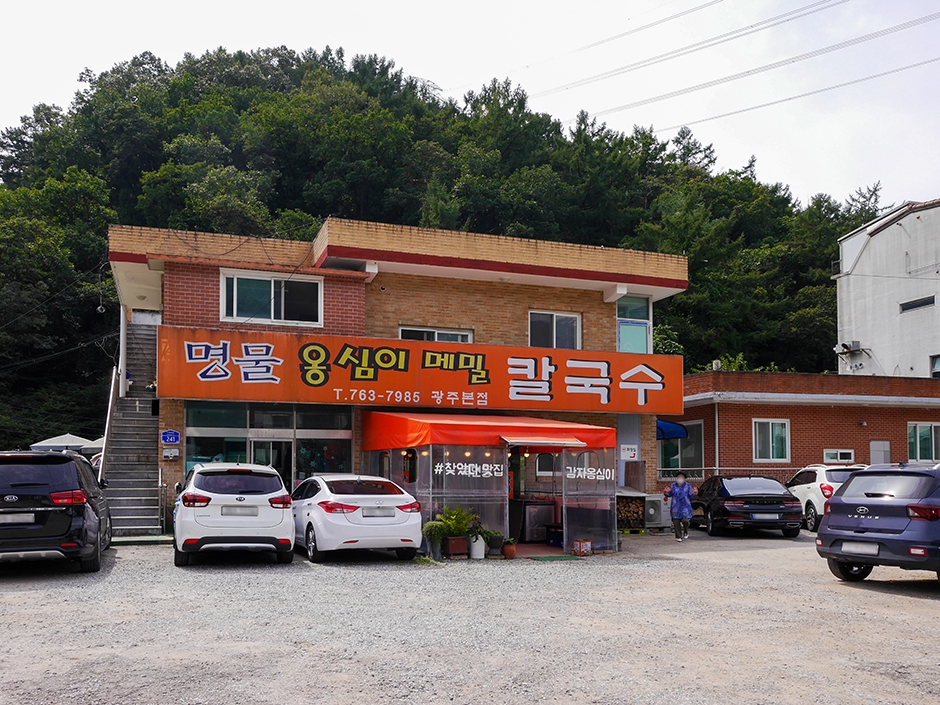 명물옹심이메밀칼국수는 목현동 끝자락 광주시 탄벌동이 가까운 곳에 있는 옹심이메밀칼국수 전문점이다. 매장 앞에 넓은 주차장이 있어 주차가 편하다. 오래된 식당으로 다소 허름한 외관에 주황색 간판이 눈에 띄는 건물로 내부는 깔끔한 좌식 테이블이다. 주문하면 바로 보리밥과 열무김치와 무생채가 제공되어 음식 조리되는 동안 가볍게 식사할 수 있다. 재료가 소진되면 일찍 문을 닫기 때문에 늦은 오후 방문 시 전화 확인이 필요하다. 종종 대기가 있어 입구 옆에 대기석이 별도로 준비되어 있다. 비조리로 포장되는 팥옹심이를 제외한 모든 메뉴는 조리되어 포장된다.
