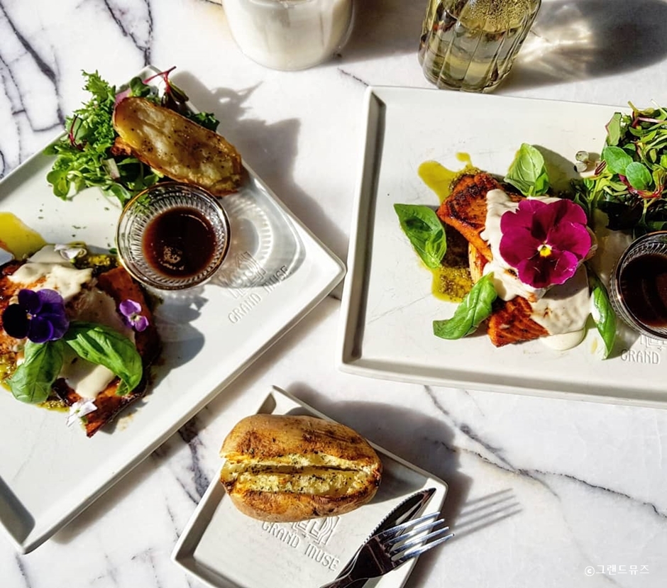 그랜드뮤즈는 경기도 광주 오포읍 신현리에 있는 브런치 카페이다. 분홍색 건물 2채로 실내 주차장과 카페 건물로 나뉘어 있고 주차는 매장 앞 야외 주차도 할 수 있다. 내부는 다양한 색감으로 화려하고 곳곳에 식물들과 고풍스러운 가구들이 배치되어 있다. 1층 매장과 건물 뒤쪽 야외에 다양한 크기의 테이블이 여유롭게 놓여 있고 입구 밖에 오른쪽으로 계단을 따라 올라가면 옥상에 파라솔과 빈백으로 꾸며진 좌석이 있어 많은 인원을 수용할 수 있다. 이 카페는 슈니첼, 크랩 로제파스타, 그뮤 잠봉 샌드위치 등의 브런치 메뉴가 있고 뮤즈 라테, 디핑 너티 라테, 아메리카노 등의 커피 메뉴와 허브티, 에이드, 스콘 등의 음료와 디저트가 준비되어 있다. 브런치 메뉴는 1층 실내 좌석과 1층 야외 테이블에서만 이용할 수 있다. 그랜드뮤즈는 실내, 실외 모두 반려동물을 동반할 수 있는 곳으로 이동 가방이나 목줄은 필수이다.