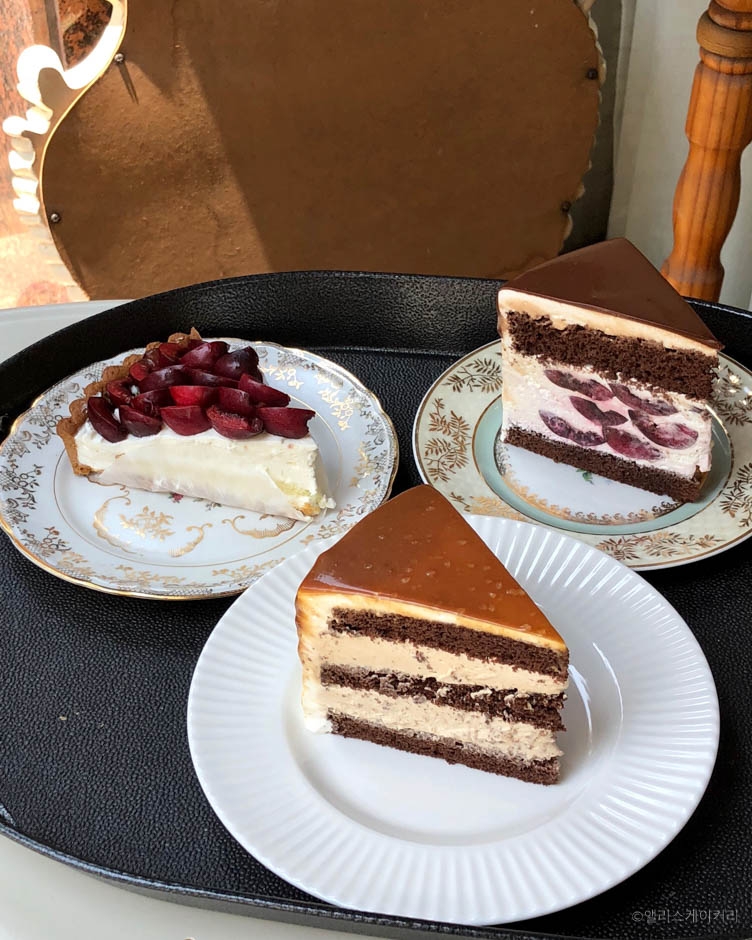 일산 밤가시마을(일명 밤리단길)에 있는 앨리스 케이커리는 케이크 맛집이다. 아담한 외관은 크림색의 감성적인 디자인이고 내부 인테리어는 우드를 기본으로 하여 빈티지하고 앤틱한 소품을 잘 활용하여 꾸며 놓았다. 넓고 큰 창문을 통해 보이는 파릇한 식물과 따스하게 들어오는 햇살이 사진찍기에 좋다. 쇼케이스 안에는 십여 가지 케이크가 들어 있는데 매일매일 케이크 라인업이 달라지고 매장 인스타그램에 그날그날 업데이트된다. 쌀로 케이크를 만들어서 많이 달지 않고 제철 과일로 토핑한 제철과일케이크도 판매되고 있다. 주차 공간은 많지 않고 가게 앞에 하면 된다.