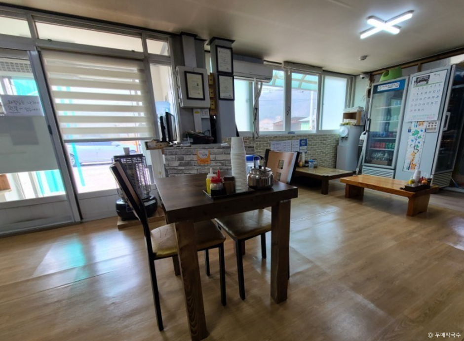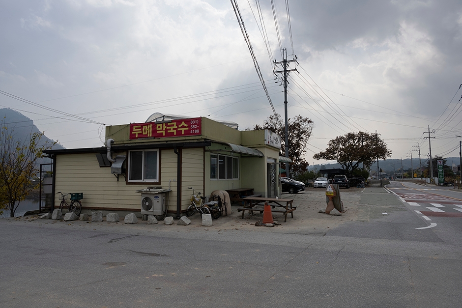 두메막국수는 현지인들이 추천하는 막국수 맛집으로 용추계곡 입구에 있다. 식탁은 내부와 외부에 배치되어 있다. 내부는 오래되었지만 깔끔하게 정리되어 신발을 벗고 올라가는 좌석이고, 외부는 테이블이 4개인데 북한강을 보면서 식사를 할 수 있다. 신을 벗는 것이 부담스러우면 외부 좌석을 이용하면 된다. 막국수를 먹는 방법은 비빔장, 설탕, 참기름을 넣어 먹다가 육수를 부어 빨간 물국수로 먹으면 맛이 더욱 깊어진다. 곁들임 메뉴로 수육과 전병을 추가할 수 있다. 수육과 전병을 시키면 빠지지 않는 것이 가평 잣 막걸리이다. 달콤하고 고소한 맛이 전병, 수육과 잘 어울린다. 주차는 매장 옆 공터에 편하게 할 수 있다.