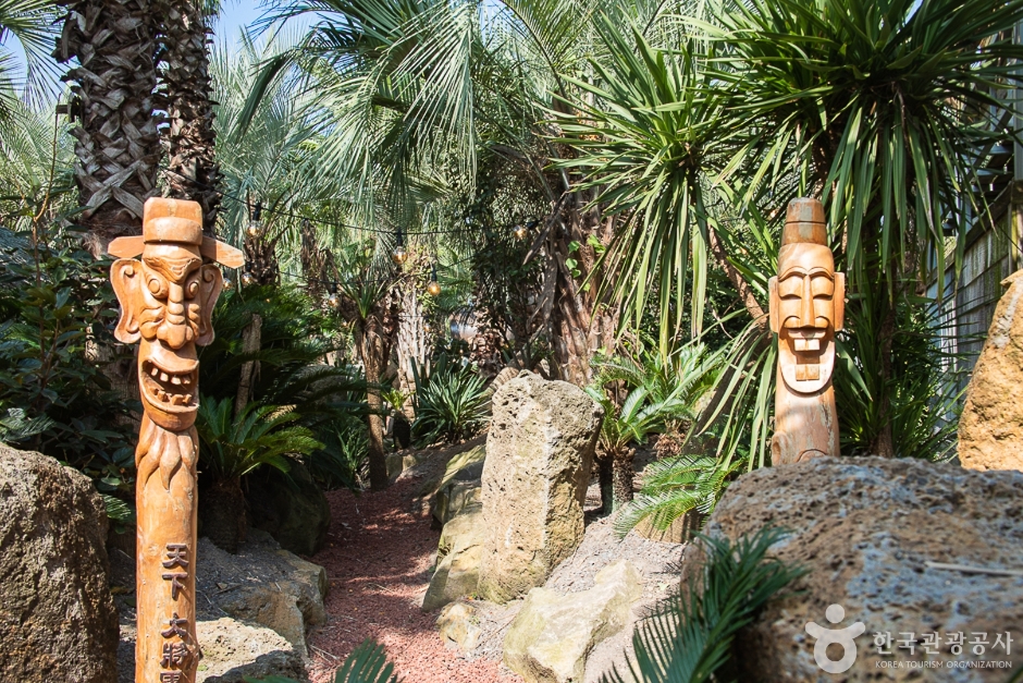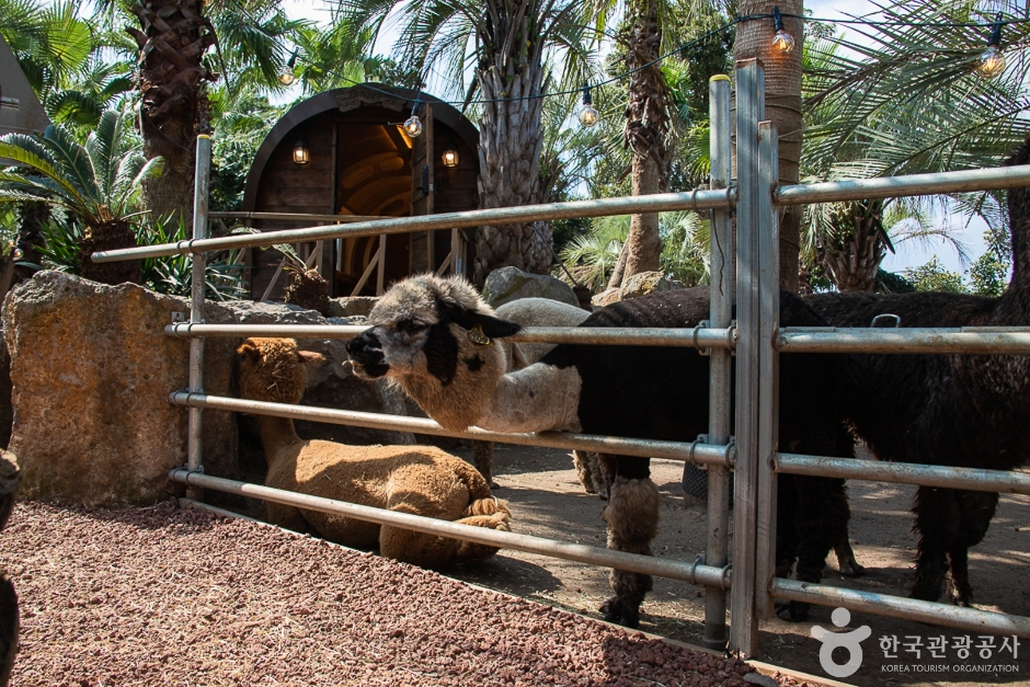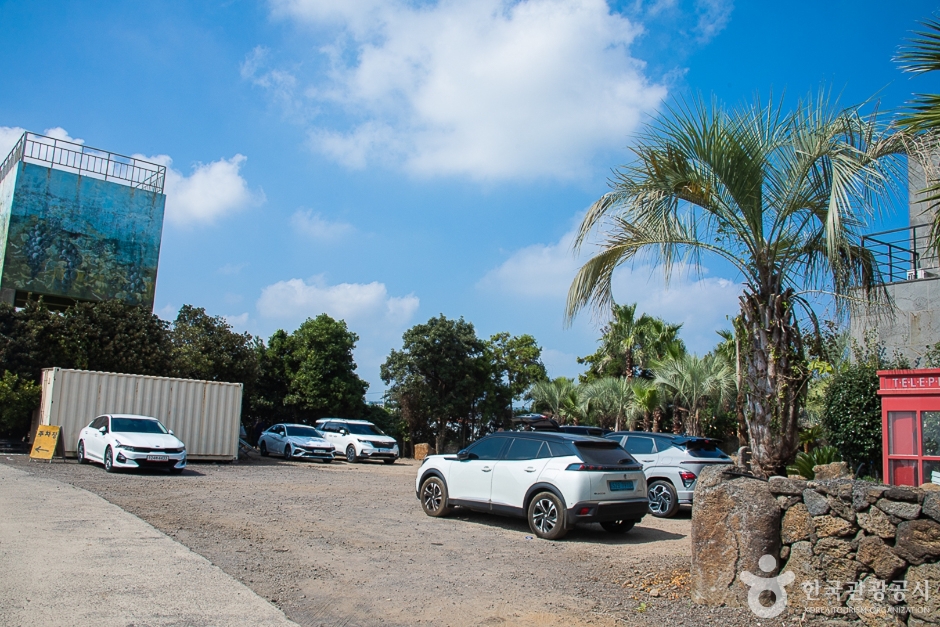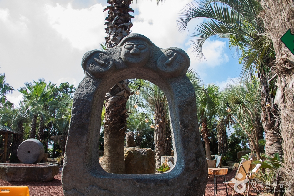대정읍 추사로에 위치해 있고 바로 앞에 산방산과 단산이 보이는 3대째 이어져 오는 제주도 귤밭으로 카페는 감귤로 실내 인테리어가 되어 있다. 실내 카페공간을 나오면 이국적인 정취가 느껴지는 야자나무밭과 화산송이로 이루어진 길을 따라 곳곳에 해먹의자, 침대의자들과 테이블이 넉넉하게 있어 여유롭다. 나무들 사이 곳곳에 다양한 조형물들이 있는 포토존과 아이들이 타고 놀 수 있는 유아용 트랙터, 마차 속 카페와 구석구석 예쁜 길을 찾아다니는 재미도 있어서 아이와 함께한 가족여행지로 인기가 높다. 음료를 주문하면 야외 넓은 공간에서의 동물 먹이 주기 체험도 가능하고, 야외 중앙에 있는 화로대에서 마시멜로우도 구워 먹을 수 있으며 군고구마 파는 곳도 있어 다양한 경험을 할 수 있는 가성비 높은 이색적인 카페이다. 오후 5시 넘어 일몰이 지기 시작하고 조명이 켜지면 야외의 감성 캠핑장 느낌이 물씬 풍겨나기도 한다.