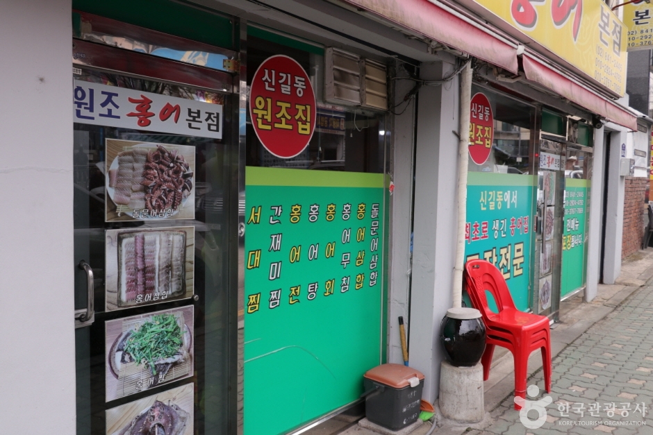 원조홍어는 영등포 신길동에 홍어 요리를 전문으로 하는 음식점들이 모여 거리를 이룬 곳에 있는 홍어 요리 전문점이다. 원조 홍어 전문식당과 원조 홍어 전문 본점으로 운영하다가 원조홍어로 통합하여 운영 중이다. 홍어를 주문하면 홍어 무침, 홍어탕, 홍어애, 홍어전이 나와서 대표메뉴 하나만 주문해도 여러 가지 홍어 요리를 골고루 먹을 수 있다.