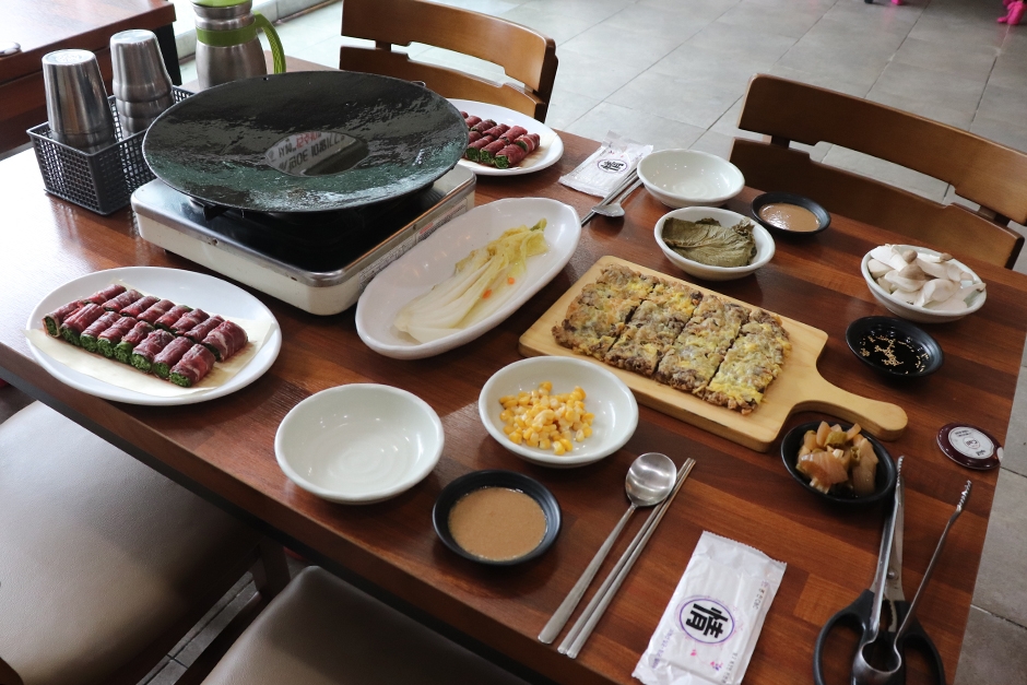 육전과 불고기도 맛있고 된장찌개도 있다. 기본적으로 제공되는 밑반찬은 장아찌, 직접 담근 깻잎장과 배추 물김치 등이고 고기말이를 찍어 먹을 수 있는 독특한 소스도 함께 제공된다. 들기름을 아낌없이 뿌린 불판이 적당히 달아오르면 사장님이 등장해 직접 고기를 구워준다. 들기름의 고소한 향이 매력적이고 얇은 소고기가 부추와 깻잎을 말고 있어 모양새부터 남다르며 식감과 비주얼까지 최강의 조합을 자랑한다.