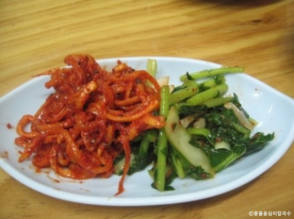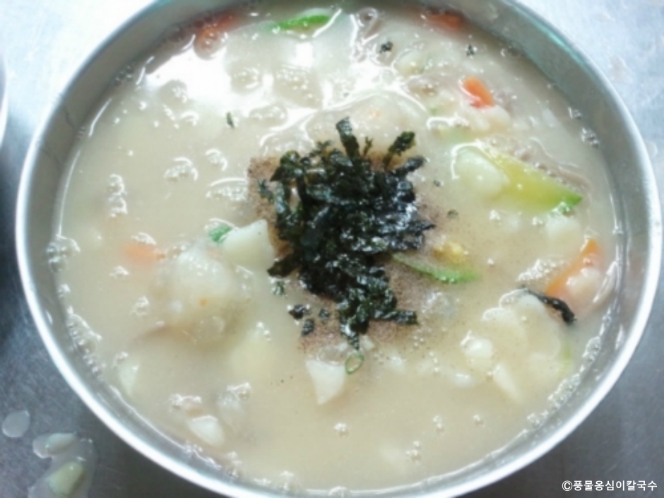 풍물옹심이칼국수는 강원도 춘천시에 있는 강원도 토속 음식점이다. 옹심이만, 메밀칼국수 둘을 섞은 옹심이 칼국수이다. 곁들임으로 메밀만두, 메밀전병, 수수부꾸미가 있다. 여름에는 시원하게 메밀막국수를 즐길 수도 있다. 반찬으로 주는 열무김치와 무말랭이무침도 강원도의 맛 그대로를 지켜내는 집이다. 옹심이나 칼국수를 시키면 작은 그릇에 보리밥을 주는데 이것은 애피타이저다. 열무김치와 무말랭이를 조금 넣어 비벼 먹거나 나중에 옹심이 국물에 말아 먹어도 좋다. 지금은 별미지만 예전에 쌀이 없던 시절에는 귀한 한 끼였을 음식이었으리라. 그래서 그런지 웨이팅이 길어도 기다렸다 먹고 가는 어르신 손님들이 많다. 남춘천역 부근에 있는데 별도 주차 공간은 없다. 주별 골목이나 유료 주차장을 이용해야 한다.