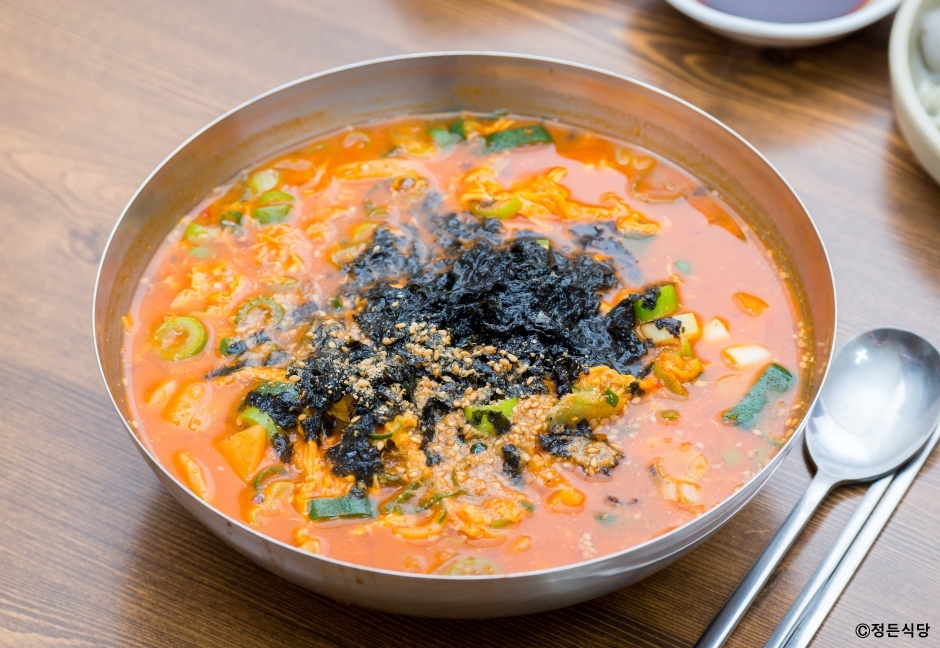 정든식당은 강원도 속초시에 있는 장칼국수 원조 식당이다. 1994년에 강원도에서 처음으로 장칼국수라는 음식을 개발해서 사업을 시작했다. 직접 반죽해서 숙성시킨 반죽을 그때 밀고, 썰고, 끓이기 때문에 음식 제공에 조금 시간이 걸린다. 장칼국수는 재래 장맛으로 국물 맛을 내고, 수타로 뽑은 면으로 꼬들꼬들하고 시원하면서도 깊은 맛이 난다. 주메뉴는 장칼국수 외에도 곁들임으로 먹을 수 있는 귀욤만두가 있다. 장칼국수 말고 다른 것을 원하는 동반자가 있다면 흰칼국수, 잔치국수, 장국밥을 주문할 수도 있다. 주차는 가게 앞이나 가게 앞 공터에 할 수 있고, 두 군데 모두 빈자리가 없으면 문화회관 옆 골목에 할 수도 있다.