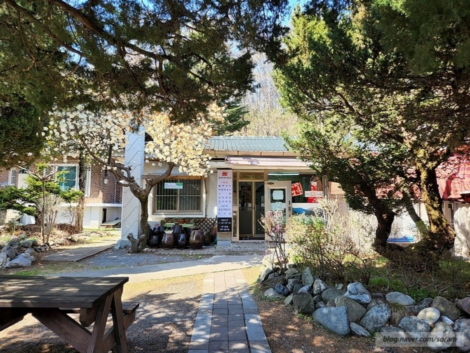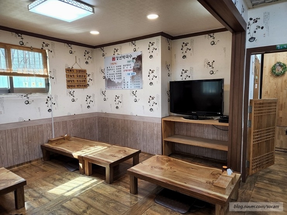 강산 막국수는 태백시 황지동에 있다. 봄이면 목련이 흐드러지게 피는 넓은 정원을 지나야 매장이 나온다. 막국수를 전문으로 하는 곳으로 대표 메뉴는 막국수와 수육, 곁들여 먹을 수 있는 녹두 부침, 감자 부침, 수육, 가자미회 등이 있다. 수육은 윤기가 흐르고, 비빔막국수는 고소한 기름 냄새를 풍기며, 물막국수는 새콤한 국물이 시원하다. 평소에도 웨이팅이 길기 때문에 도착하면 대기자 명단에 이름과 인원수를 빠르게 적고 정원을 둘러보며 기다리면 된다.