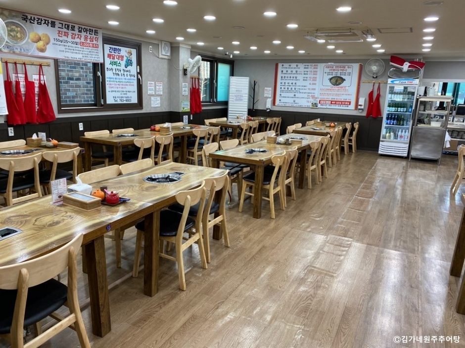 김가네원주추어탕은 강원도 원주시에 있는 원주 향토 음식 추어탕 전문점이다. 원주 추어탕은 다른 지역과 다르게 테이블에서 끓여 먹으면서 수제비를 넣어 먹는다. 다른 지역보다 매운맛도 더 있는 편이다. 추어탕은 갈아서 만든 것과 통으로 넣은 것을 별도로 판매한다. 좀 더 매운맛을 내는 얼큰이 추어탕도 있다. 밥은 공깃밥과 돌솥 밥을 선택할 수 있다. 지역 맛집이기도 하고 전국에서 손님들이 찾는 맛집이기도 하다. 근처에 사는 현지인을 위해서는 포장 창구를 별도로 두고 포장 판매를 하고 있고, 타 지역인에게는 택배 서비스를 하고 있다. 매장 건너편에 넓은 전용 주차장이 있어 이용이 편리하다.