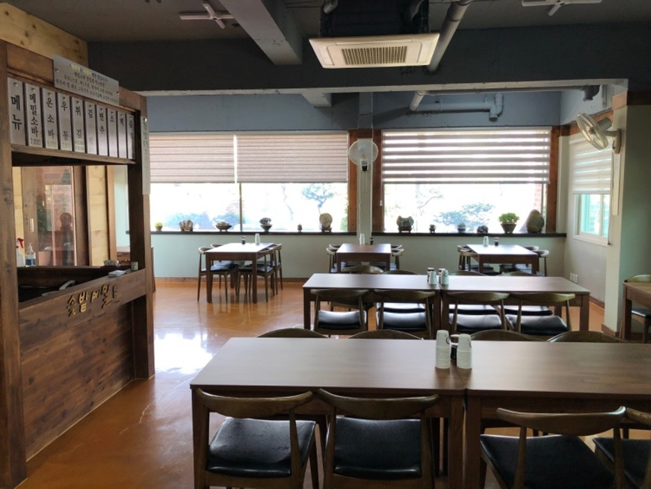솔밭메밀소바는 경상북도 포항시 북구 흥해읍 성곡리에 위치하고 있다. 깔끔한 외관과 차분한 분위기를 연출하는 인테리어가 눈에 띈다. 대표 메뉴는 무, 파, 고추냉이를 취향에 맞게 넣어 먹을 수 있는 메밀소바다. 이 밖에 온 소바, 비빔 소바, 우동, 김밥 등을 판다. 겨울철에는 옛날 수제 돈가스도 맛볼 수 있다.