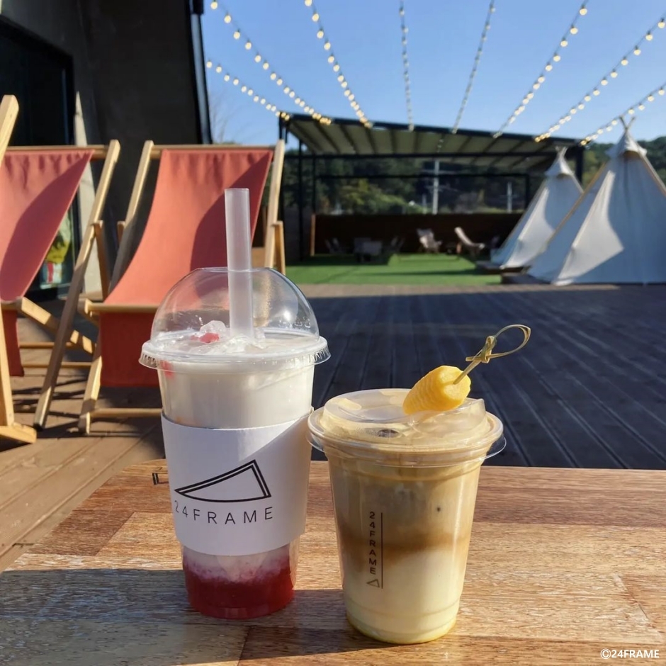 24FRAME은 강원도 강릉시에 있는 베이커리 카페이다. 넓게 펼쳐진 논이 보이는 전망은 사계절의 변화하는 모습을 지켜볼 수 있다. 강릉 두부라테, 강릉 옥수수라테, 강릉 흑임자라테, 강릉 버터크림라테 등 특별한 라테들이 시그니처 메뉴이다. 매일 신선한 재료로 구워 내는 신선한 빵들도 디저트 메뉴로도 인기이고, 포장 손님들도 많다. 천연 발효종을 사용해서 만드는 빵은 당일 생산, 당일 판매 원칙을 지키고 있다. 루프탑에는 선베드 같은 의자와 파오 같은 천막이 준비되어 있다. 실내는 창가 쪽으로는 입식 좌석이 안쪽으로는 좌식 좌석이 준비되어 있어 취향대로 편한 좌석을 선택할 수 있다. 매장 앞에 전용 주차장이 있다.