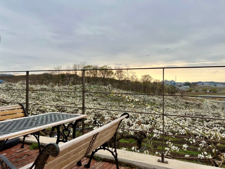배나무숲은 충청남도 천안시 서북구 직산읍 양당리에 있는 대형 디저트 카페다. 매년 4월 중순경이면 카페 주변이 하얀 배꽃으로 뒤덮이는 장관을 연출한다. 천장까지 닿아있는 통창을 통해 바깥 경치를 만끽할 수 있고 자연친화적으로 꾸민 외부에도 테이블을 배치해 반려동물과 함께 입장할 수 있다.