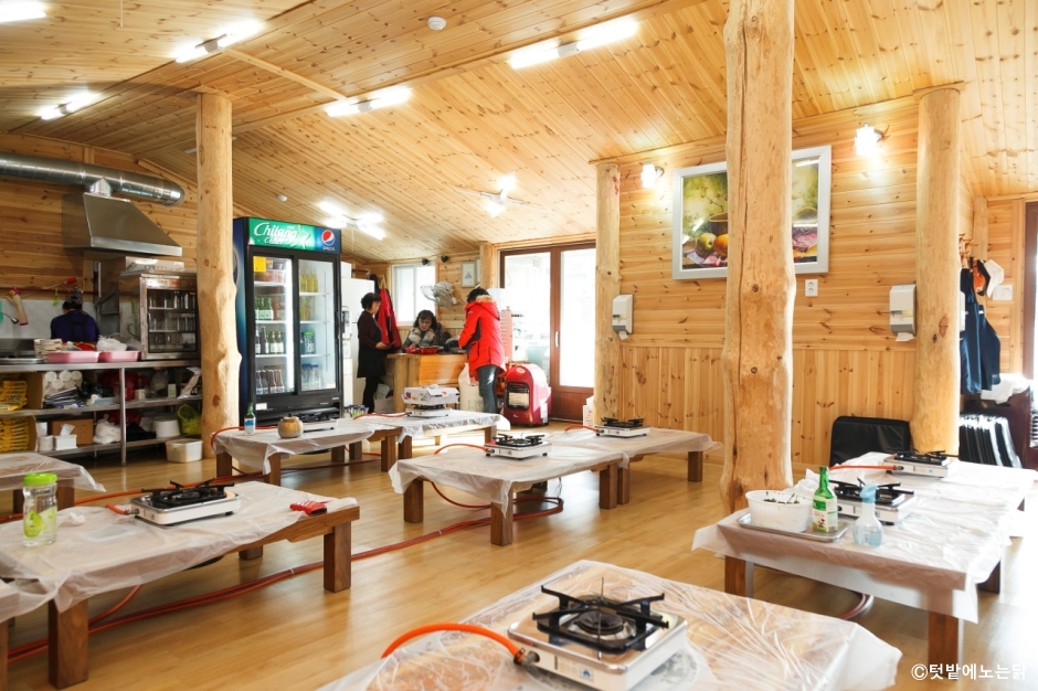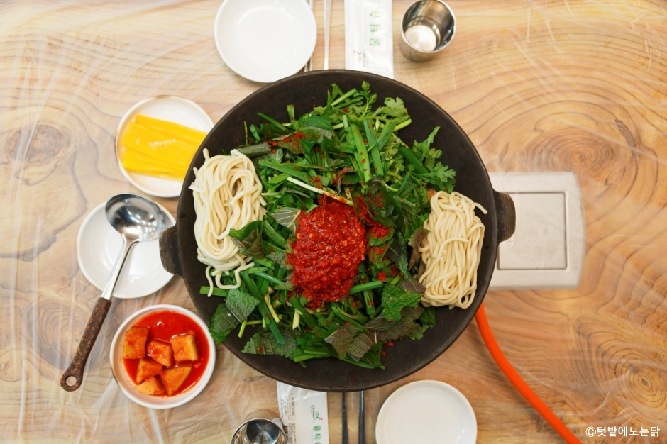 텃밭에노는닭은 강원도 삼척시에 있는 물닭갈비 전문점이다. 평일에는 강원대 학생으로 가득 차고, 평소에는 지역 주민들로 붐빈다. 명절에는 고향을 찾는 토박이들이 옛날 맛을 잊지 못하고 다시 찾아오는 곳이다. 조용하고 작은 시골 마을에 있는 식당인데도 항상 북적북적하다. 물닭갈비는 육수에 닭갈비를 끓여 먹는 음식이다. 매운맛과 순한 맛을 골라 선택할 수 있다. 주문을 하면 미나리와 깻잎이 잔뜩 올려진 닭갈비에 우동사리가 얹혀 나온다. 이곳은 사리를 처음부터 추가해야 한다. 반찬은 단무지와 무김치다. 메인 메뉴가 자극적이라 별도 반찬은 필요하지 않다. 볶음밥이 별미인데, 나중에 밥을 볶아 먹으려면 국물을 조금 남기면 된다. 주차장은 길 건너에 주차 공간이 넉넉하게 있다.