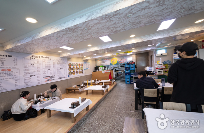 순대집들이 늘어선 골목길에 위치한 88순대국에는 각별한 맛이 숨어 있다. 팔팔 끓여내는 순대국 한 그릇에 3대에 걸쳐 축적된 노하우들이 오롯이 담겨 있다. 그야말로 세월의 맛이다. 88순대국의 메뉴에는 순대가 들어가 있지 않은 것이 거의 없다. 순대국밥부터 김치순대국밥, 오징어순대, 아바이순대, 아바이순대라면 등 조금씩 다른 순대 음식을 맛볼 수 있다. 변화하는 입맛에 맞춰 꾸준히 메뉴를 연구하고 개발해온 결과이다. 골고루 맛보고 싶다면 모듬 메뉴를 주문하면 된다. 아삭한 김치와 깍두기는 순대국과 찰떡궁합을 이룬다. 순대가 취향이 아닌 경우 내장탕이나 선지해장국, 소머리국밥 같은 메뉴도 마련되어 있다. 뭐니해도 이곳에서 꼭 맛봐야 할 음식은 아바이 순대이다. 보통 당면을 넣어 속을 채우는 일반 순대와 달리 각종 야채와 콩, 고기를 골고루 섞어 만든 독특한 맛과 식감을 즐길 수 있다.