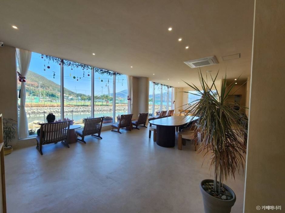 하동 주소이지만 남해 들어가는 노량대교와 남해대교와 근접해 있어 여행객들의 이용이 쉬운 위치이다. 남해대교와 노량대교 뷰를 바라볼 수 있는 바다 전망에 카페 전체 베이지 톤의 유럽 감성을 담은 멋진 인테리어와 곳곳의 소품과 작품들이 카페를 방문한 고객들에게 예쁜 사진 명소와 힐링을 안겨줄 수 있는 공간이다. 카페의 좌석들은 휴식하기에 충분한 감각적인 디자인의 아주 편안히 등을 기대고 앉아 바다를 바라볼 수 있고 산을 올려다볼 수 있도록 배치되어 있다.