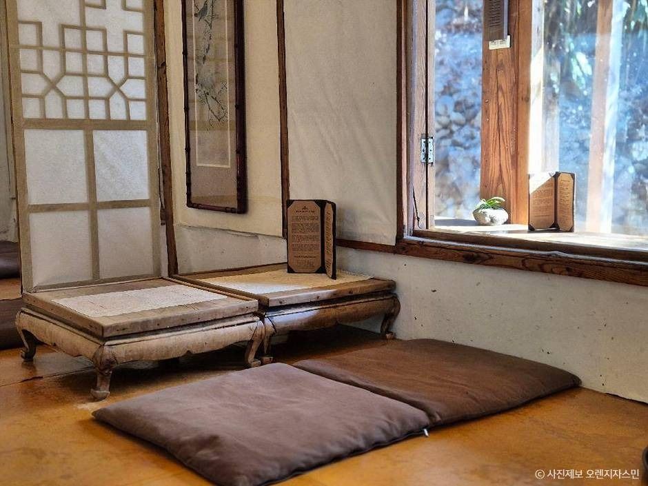 새소리 물소리 건물은 크게 본채와 별채로 이루어져 있다. 본채 건물인 기와집은 사장님의 고조부께서 직접 지었다. 뒤로는 산을 두고 앞으로는 천이 흐른다. 집은 남향을 향하고 곁에는 연못을 두어 풍수지리에 맞게 터를 잡아 1923년에 3년여의 공을 들여 완성한 챙이 넓은 게 특징인 조선한옥이다. 2024년 경기도지정 문화재로 선정되었다. 한옥 주위로는 성남시 보호수로 지정된 300년 된 느티나무와 팔각정자, 그리고 연못과 우물이 있으며, 그 외 오래된 감나무, 밤나무, 앵두나무, 대추나무, 자두나무 등의 과실수가 많아 강남에서 가장 가까운 거리에 시골의 정취를 느낄 수 있다.