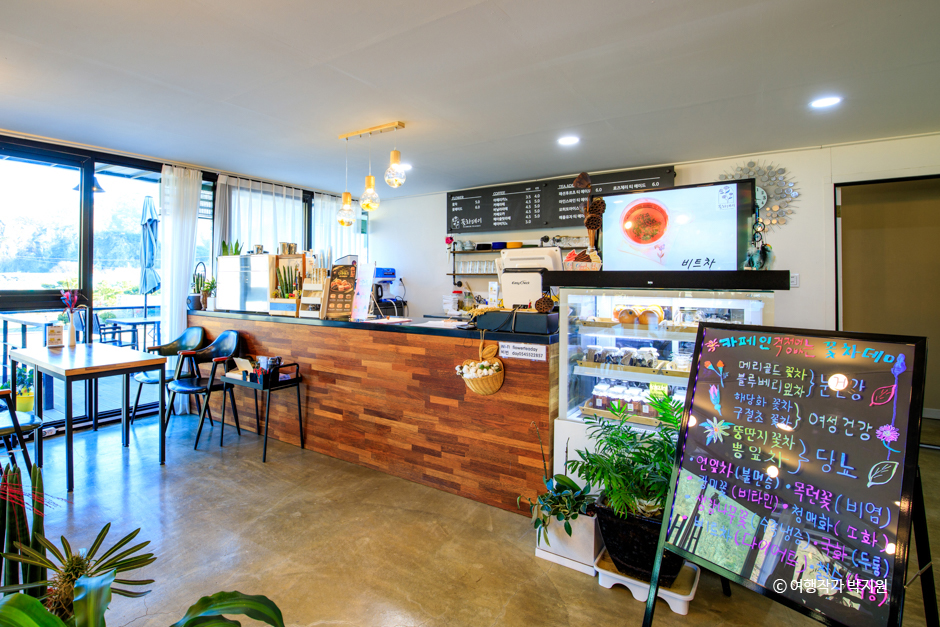 꽃차 DAY는 메리골 드꽃차, 비트차, 백연잎차, 국화차 등 꽃 차를 맛볼 수 있는 공간이다. 내부에 발을 들이면 심신이 안정을 찾는 기분이다. 밝고 온화한 분위기의 인테리어, 감각적이고 아늑한 조명, 귓가를 간질이는 잔잔한 음악, 바깥 경치가 온전히 보이는 통유리 덕택이다. 이곳에서는 꽃 차나 꽃 식초 만들기 체험도 진행한다. 7세 이상이면 누구나 가능하다. 원하는 꽃을 고른 다음 자신이 원하는 농도의 베이스를 만들어 끓인 후 용기에 담으면 끝이다. 모든 과정을 꽃차 DAY 대표가 함께하기에 어려울 것이 없다.