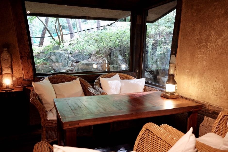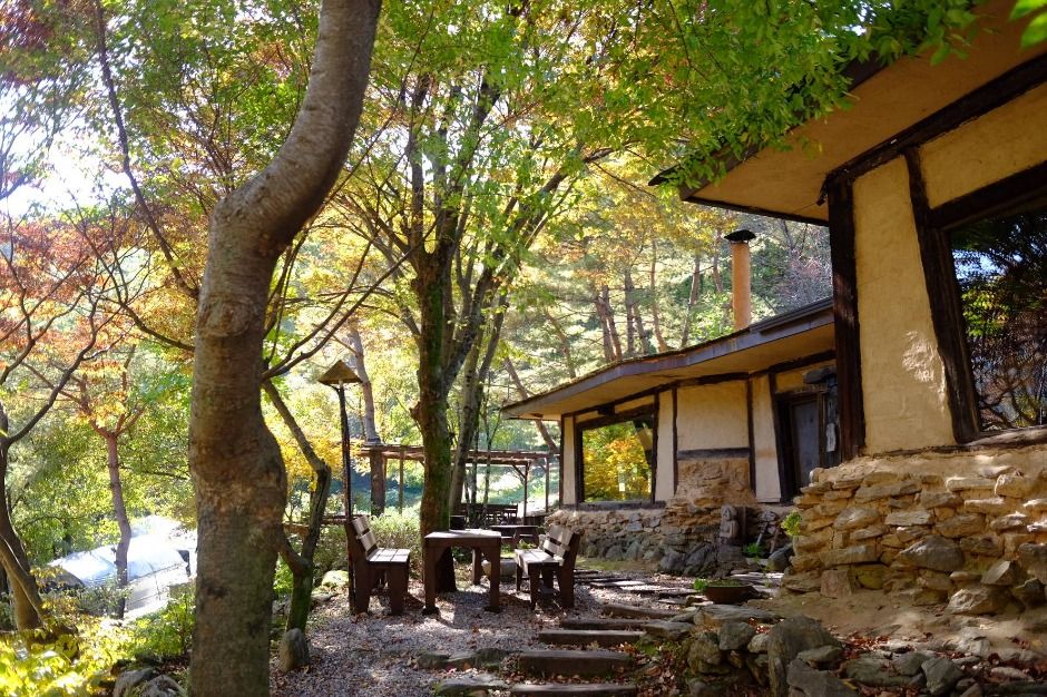치악산 상원사로 오르는 길, 매표소를 지나 작은 개울을 건너면 길 이름처럼 소롯 길이 나무 사이로 수줍게 모습을 드러낸다. 황토와 돌로 축대를 쌓고 벽을 올린 뒤 너와로 지붕을 얹은 강원도 산골의 너와집 풍경 그대로다. 카페 겸 식당으로 이용되지만 주로 음식을 찾는 손님들이 많다.