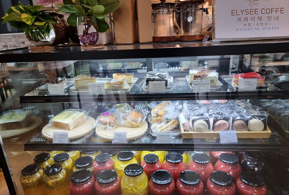 엘리제 커피는 지리산 천왕봉 가는 길목 선비문화연구원 옆에 있는 분위기 좋은 디저트 카페이다. 카페 앞엔 아기자기한 다육이들과 정갈한 화분들이 정렬돼 있고 널찍한 매장은 우드톤으로 차분함과 고급스러움을 살렸다. 지리산은 곶감과 함께 벌꿀도 알아주는 지역 특산품인데 엘리제에서는 모든 음료에 인공 감미료가 아닌 직접 채취한 천연벌꿀을 사용한다. 판매되고 있는 수제청도 모두 천연벌꿀을 이용하였다. 차를 마신 뒤 전국 택배 판매가 가능한 수제청과 벌꿀도 구경할 수 있다. 주차장이 넓어 편리한 이용이 가능하다.
