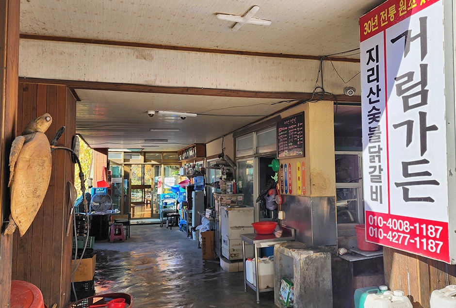 지리산 거림 가든은 경상남도 산청군 시천면에 있는 한식당이다. 현지인들이 추천하는 맛집으로 대표 메뉴는 숯불닭갈비다. 식당 내부는 넓은 공간으로 되어 있고 테이블에 여유 있게 배치돼 있다. 창밖으로 지리산 계곡이 펼쳐져 있어 지리산의 사계절 풍경을 즐기며 식사할 수 있다. 숯불닭갈비 외에도 토종닭 백숙, 오리백숙, 염소고기 등이 있고 산채비빔밥과 된장찌개, 도토리묵, 파전 등이 있다. 다양하고 맛있는 메뉴들이 갖추어져 있고 밑반찬도 맛있다. 주차는 할 수 있지만 넉넉하지 않다.
