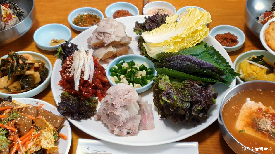 오수물막국수는 강원도 춘천시에 있는 강원도 토속음식전문점이다. 막국수, 보쌈, 촌두부, 편육, 전병, 빈대떡, 도토리묵 등을 판매한다. 막국수를 주문하면 반찬으로 독특하게 양배추김치, 열무김치가 나온다. 보쌈은 쪽파가 포함된 야채 모둠이 나오는데 아주 신선하다. 막국수에는 새싹이 고명으로 나오는데 식초, 겨자, 설탕을 약간 넣어 입맛에 맞춰 먹으면 된다. 보쌈에는 육수에 담긴 연두부가 나온다. 고소하고 시원한 맛이 일품이다. 보쌈과 막국수의 맛이 입소문이 나서 찾는 손님들이 많다. TV에도 여러 번 소개되어 유명세 때문에 대기가 있을 수 있다. 주차는 매장 앞에 전용 주차장이 있어 이용이 편리하다.