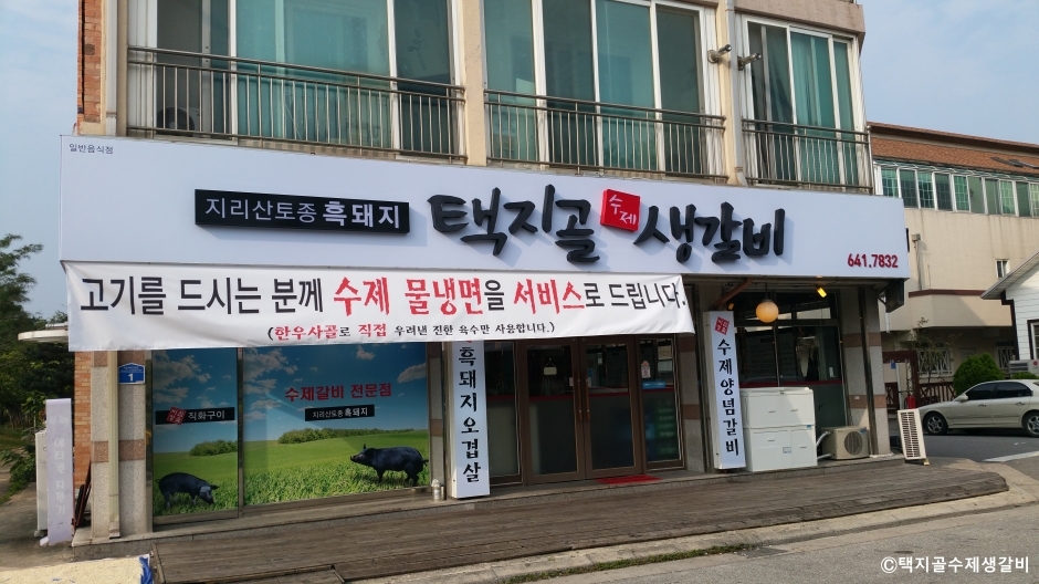 택지골수제생갈비는 강릉시 교동에 있는 고기 전문 식당이다. 한돈을 사용해서 만드는 돼지갈비와 지리산 흑돼지 오겹살, 수제 소갈비가 주 메뉴이다. 고기를 굽는 불은 화력이 좋은 비장탄 숯을 사용하고 있어 기름을 쪽 빼가며 맛있게 구워진다. 해산물 식당이 많은 강릉에서 빠지지 않는 고기 식당이다. 고기를 다 먹은 후에는 시원한 물냉면과 비빔냉면을 즐길 수 있다. 항상 대기가 있는 편이어서 방문할 때는 브레이크 타임이 없는 식당이므로 피크타임을 피하는 것이 좋다. 주차는 매장의 전용 주차장이 있지만 빈자리가 없으면 주변에 공영 주차장이 있어 편하게 이용할 수 있다.