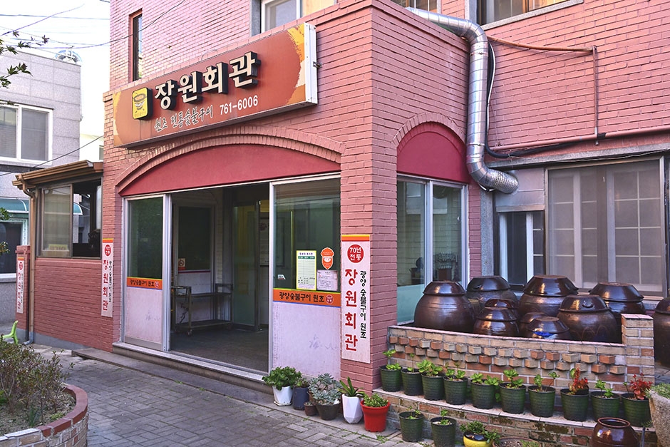 빨간 벽돌 외관의 원조 전통 숯불구이 집이다. 차 한 대가 겨우 다닐 정도의 골목을 지나면 나오는 식당이 바로 장원회관이다. 오랜 전통을 자랑하며 본채와 별채가 따로 있고 본채는 좀 더 프라이빗하게 별채 쪽은 야외 느낌이라 서로 다른 분위기를 자아낸다. 입구부터 달달한 고기 냄새가 맞이해 주는 장원회관은 불고기는 호주산과 국내산 따로 있으며 소특양구이도 있다. 김치와 쌀을 순수 국내산으로 사용하고 있다. 고기를 굽는 석쇠도 화로도 원조 격이라 오랜 세월의 흔적이 그대로 느껴진다.
