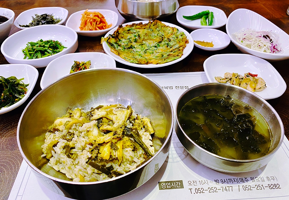 울산 동구 방어동 유명한 맛집 섬뜰은 전복요리 전문점이다. 특히 전복밥은 전복이 가득 들어 있으며 밑반찬도 바삭바삭한 전과 미역국은 물론 오색 나물, 누룽지까지 알찬 구성으로 나온다. 정갈한 한식으로 건강한 한 끼를 먹으러 오는 오랜 단골이 많다. 전복밥에 양념장과 부재료를 넣어 비벼 먹는 방식이 독특하며, 전복구이와 전복찜 등 다른 메뉴도 높은 평가를 받고 있다. 근처에 출렁다리로 유명한 대왕암공원과 슬도가 있어 함께 둘러보기 좋다.