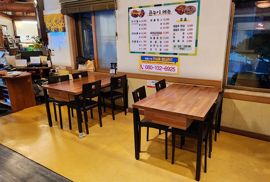 거제 고현동에 있는 큰누이찜은 아귀찜 맛집이다. 큰 규모의 식당 내부는 나무랑 황토가 어우러져 깔끔하며 개별 룸과 홀이 완비되어 있어 가족 식사, 회식, 단체 모임으로 오기 좋은 곳이다. 접시 위에 넘칠 듯 올라간 푸짐한 아귀찜은 보기만 해도 먹음직스럽다. 아귀찜은 먹기 좋은 크기로 되어있어 먹기도 편하다. 밑반찬을 포함한 상차림이 깔끔하고 맛있다. 큰누이 식당의 모든 재료는 국산만 사용한다. 거제도 포로수용소 유적공원과 거제 관광모노레일 등이 함께 둘러보기 좋은 관광 명소이다.