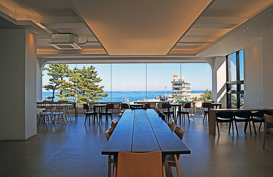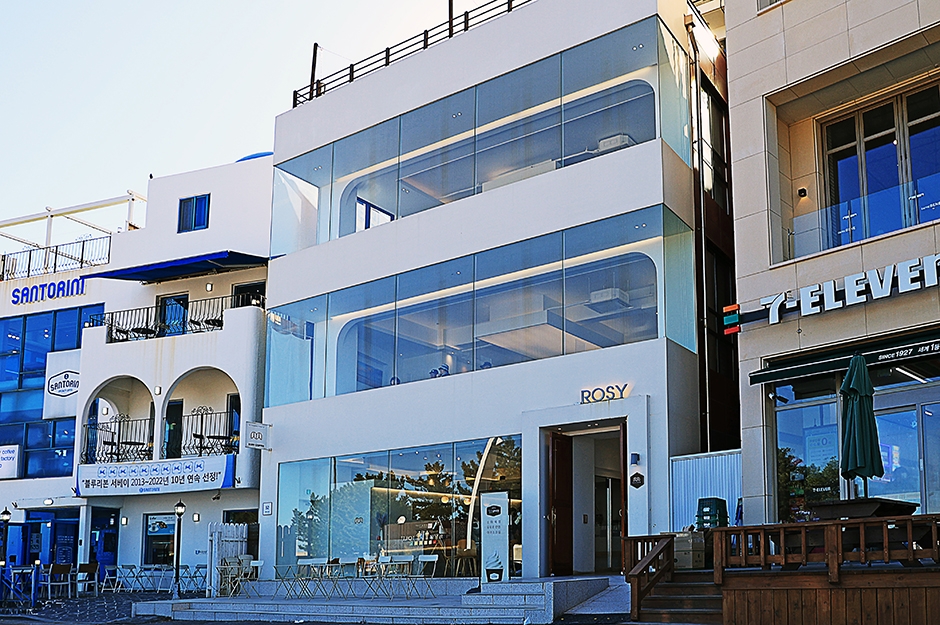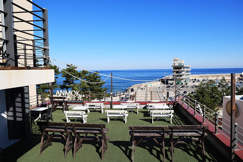 로지커피는 안목 바닷가에 화이트톤의 인테리어가 인상적인 대형 카페이다. 1층은 주문하는 곳으로 테이블을 창가 쪽에만 두어 넓고 밝은 인상이다. 2층부터 루프탑까지 층별로 화이트 톤의 실내에 밝은 톤의 원목 가구를 감각적으로 배치했다. 카페에서 내려다보는 바다 풍경도 좋아서 감성적인 인증샷을 남기기 좋다. 날씨가 좋다면 카페 앞 테라스나 루프탑도 좋은 선택이 되겠다. 위층으로 올라갈수록 바다를 감상하기 더 좋다. 진한 느낌의 라떼류가 인기가 많다. 구움 과자 및 베이커리들도 다양하게 갖추고 있다.
