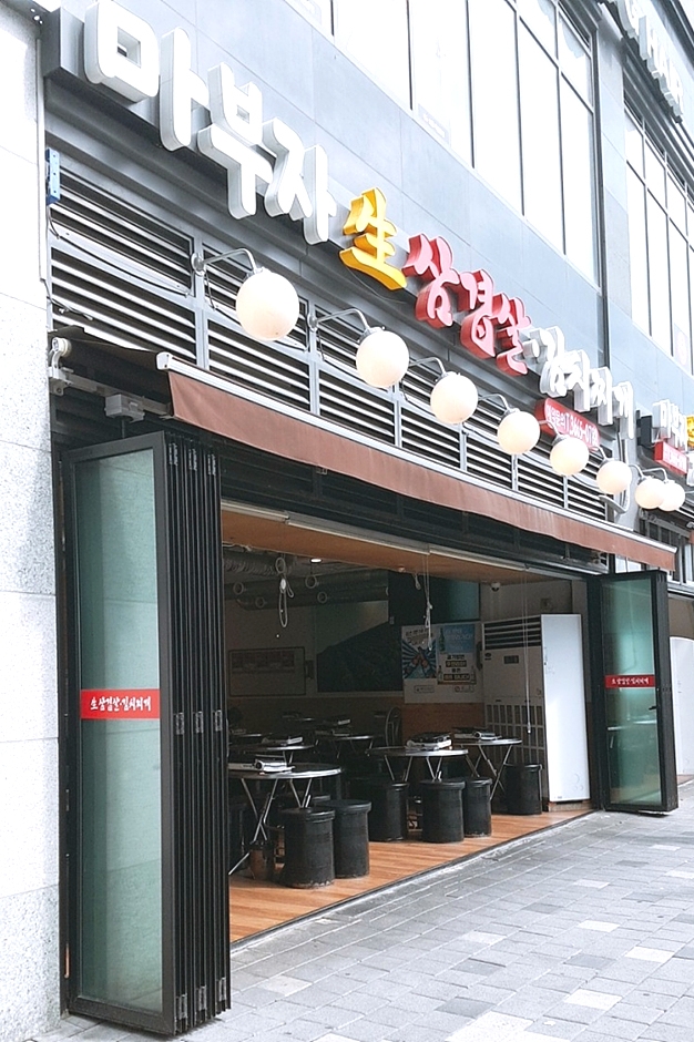 마부자삼겹살은 서울 마곡나루역 1번 출구로 나오면 바로 보이는 건물에 위치해 있다. 이곳은 두툼한 국내산 생삼겹과 김치를 함께 올려 굽는 맛집으로 유명하다. 마지막 코스로 볶음밥으로 마무리하는 조합이 인기가 많다. 대표 메뉴로 생삼겹살, 목살 등이 있으며, 후식으로는 물냉면, 볶음밥이 있다. 추가로 김치찌개와 계란말이가 많이 나간다.