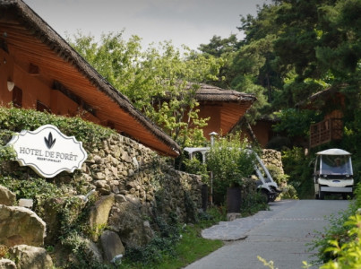 나무들이 내뿜는 음이온과 피톤치드가 가득한 숲속, 숲 내음, 바람 소리, 새소리, 풀잎 소리를 느끼며 휴식을 할 수 있는 친환경 숙박 시설이다. 호텔 드 포레는 편백나무와 황토 벽돌로 마감되어 머무는 것만으로도 힐링이 되는 건강한 쉼의 공간이다. 주차장에 주차하고 픽업 카트를 타고 숙소로 이동하는 방식이므로 이용에 참고해야 한다. 내부에는 간이매점 같은 무인 판매 시설이 있으며 저녁 9시까지 이용할 수 있다. 부대시설로는 레스토랑과 카페가 있어 이용하기 좋으며 연회장도 운영하고 있다. 그리고 투숙객은 동물원과 식물원이 있는 네이처파크를 무료 관람할 수 있으며 워터파크가 옆에 있어 가족 단위로 방문하기 좋다.