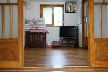 대문 옆으로 이어진 돌담과 기와지붕 위로 펼쳐지는 산자락이 아름답게 어우러지는 집, 바로 맥산댁이다. 안으로 들어가면, 양쪽에 파란 지붕의 창고가 있고 정면에는 밝은 나무색 한옥이 있다. 한옥은 2008년에 지은 건물로, 가장 왼쪽 방에 손님을 받는다.다른 집보다 높은 천장을 자랑하는 객실은, 지은 지 얼마 안 된 곳이라 그런지 여전히 나무 향이 은은하게 풍긴다. 손님들이 편하게 묵고 갈 수 있도록 싱크대와 화장실도 현대식으로 마련해 두었다.