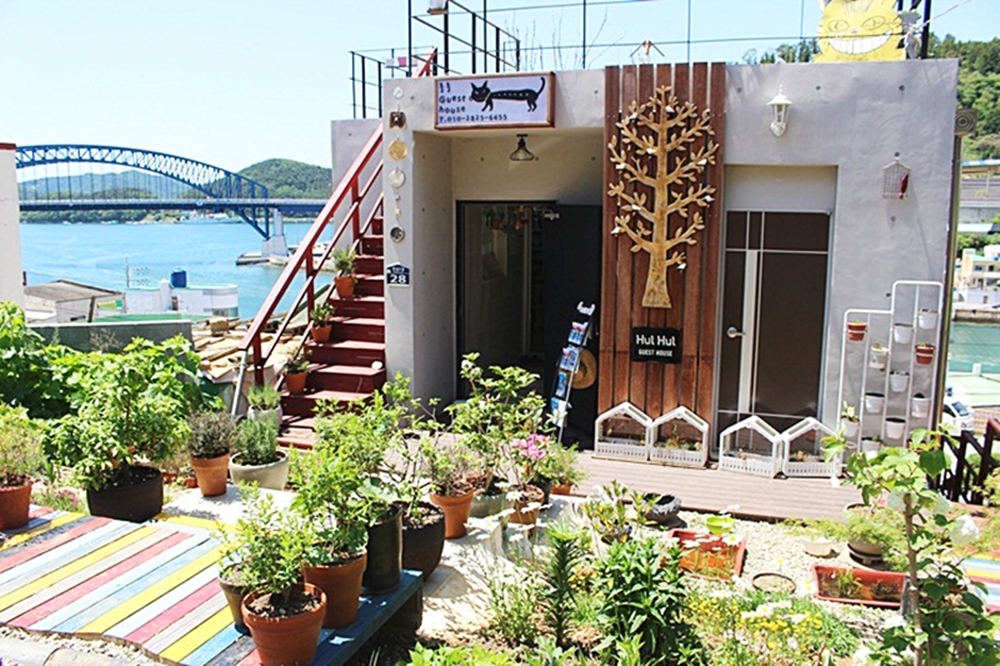 통영항 근처에 위치한 훌훌게스트하우스는 전 객실에서 바다 풍경을 바라볼 수 있는 숙소로, 통영대교 너머로 떠오르는 아름다운 일출과 일몰은 감탄을 자아낸다. 객실은 남성/여성 도미토리, 2인실, 패밀리룸으로 구성되어 있다. 아기자기한 인테리어와 청결한 관리로 손님들의 만족도가 높다. 주방에는 얼음정수기, 전자레인지, 토스트기 등이 있고 냉장고에는 식빵과 계란 음료수가 준비되어 간단한 조식을 먹을 수 있다.