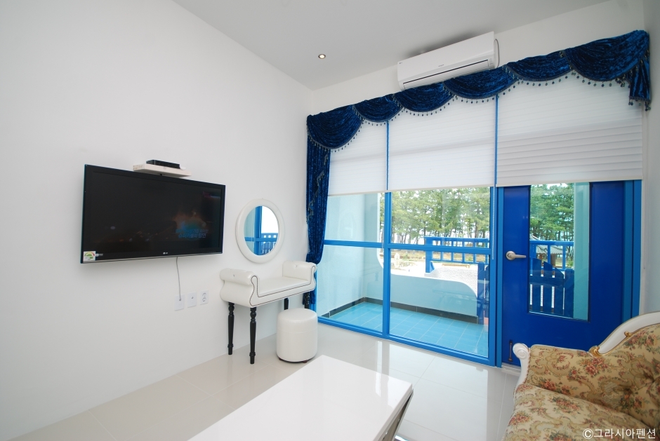 강원도 삼척시 근덕면에 있는 펜션이다. 객실 앞에 야외수영장이 있고, 주변에 파라솔과 의자가 있다. 야외수영장은 하절기에 운영하며, 한여름 뜨거운 햇빛과 파란 하늘, 빨간 파라솔, 흰색의 펜션 건물이 이국적인 분위기를 자아낸다. 밤에 건물에 조명이 들어오면 수영장 물 위로 비치는 반영은 지중해에 온 듯한 느낌을 준다. 수영장의 깊이는 약 1m이다. 모든 객실에서 바다가 바라다보인다. 도보 약 5분 거리에 편의점이 있고, 차량으로 약 10분 거리, 20분 거리에 마트가 있다. 차량으로 약 5분 거리에 궁촌항, 약 10분 거리에 장호항이 있어 항구에 있는 횟집을 방문할 수 있다. 레일바이크를 탈 수 있는 궁촌역은 걸어서 약 10분 거리에 있다. 가까이에 원평 해수욕장이 있다.