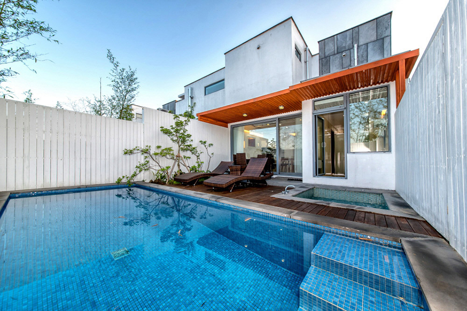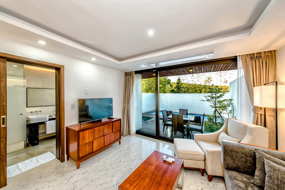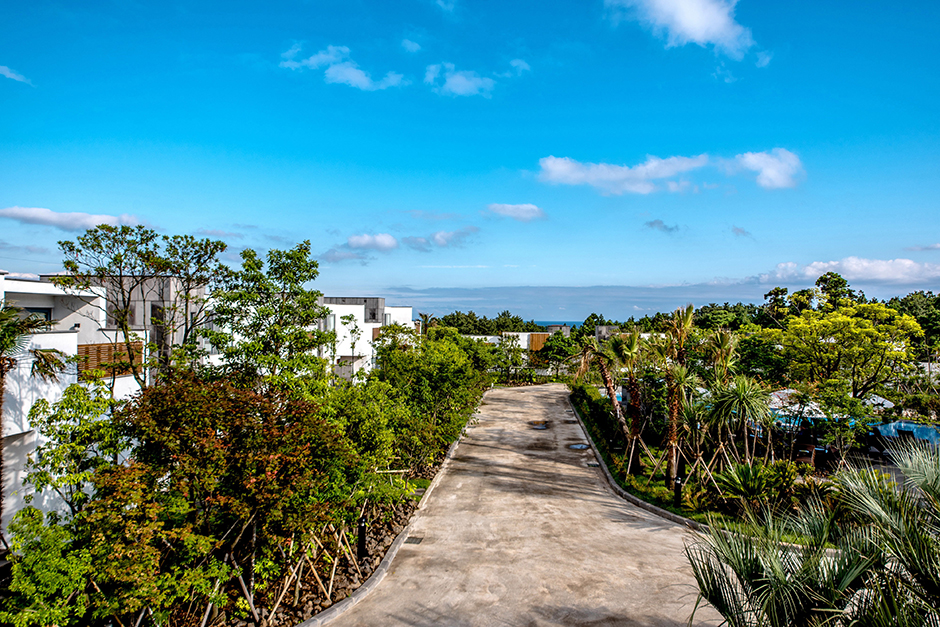 더쉼팡스파앤풀빌라의 건축물은 제주의 변덕스러운 날씨 변화에도 오래 견딜 수 있는 콘크리트 구조로 건축되었으며 고급 마감재인 제주 화산석과 스타코플렉스를 사용하였다. 쉼팡은 ‘쉬어가는 곳’이라는 제주 토속어로 아름다운 정원 중앙 수영장에서 따뜻한 야외 스파를 즐길 수 있고, 야간 조명이 더해지면 환상적인 분위기를 느낄 수 있다. 단지 내 조경은 프라이빗 공간 분리가 가능하도록 설계되어 마음 편히 휴식을 취할 수 있다. 올레 4코스와 닿아 있어 올레길 산책, 낚시 등이 가능하고 해비치 해변 근처에 위치하여 해양 레저와 다양한 먹거리도 즐길 수 있다. 우측으로는 성산일출봉, 우도, 섭지코지 등이 있고, 좌측으로는 중문 관광단지와 서귀포 시내가 있어 해안 도로를 따라 여행을 즐길 수 있는 최적의 장소이다.