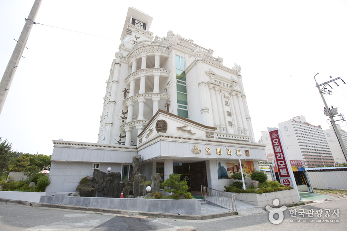 오페라모텔은 돌산대교를 건너 여수 제3 청사 근처에 위치한다. 건물의 외관은 흡사 중세 유럽의 건축물처럼 웅장하고 화려하게 되어 있어, 지나는 이들이 한 번쯤 돌아볼 만하다. 객실은 모두 화려한 색감이 돋보이는 인테리어로 꾸며져 있고, 특히 침대머리 부분을 빌로드 느낌으로 꾸민 벽이 인상적이다. 세련된 인테리어 감각이 돋보이는 특실은 침실과 거실을 시각적으로 분리하는 나무 기둥이 있어 한층 돋보인다. 오페라모텔을 오기 위해 건넌 돌산대교는 드라이브 코스로도 유명하고, 근처에 방죽포 해수욕장이 있어 여름 피서철에 인기가 좋고, 동백꽃으로 유명하다.