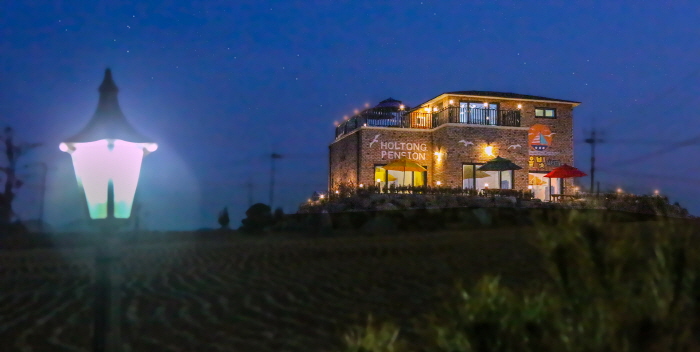 전남 무안 홀통유원지(해수욕장)와 차로 1분 이내, 광주에서 차로 40분 가량의 거리에 위치하였다. 전 객실내에서도 탁트인 바다가 펼쳐보이고, 해지는 저녁노을이 매력적이며, 넓은 황토 잔디정원, 친환경 참숯 인테리어와 야광 그림벽화로 완성된 신축펜션이다.천혜의 자연 발생적 유원지인 홀통해수욕장 앞에 자리하고 있는데, 홀통해수욕장은 울창한 해송과 긴 백사장이 장관을 이루고 있어 해수욕, 바다낚시, 해수찜, 갯벌체험 등을 함께 즐길 수 있어 피서지로 각광을 받고 있다. 또한 수심이 낮고 파도가 잔잔하여 전국 단위 윈드서핑 대회 개최 등 해양스포츠의 최적지로 손꼽히고 있다.