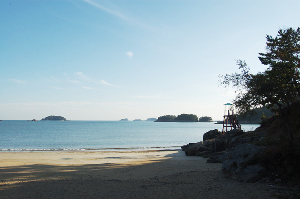 모래 찜질용 노란색의 모래가 길게 걸쳐 있는 해변입니다.