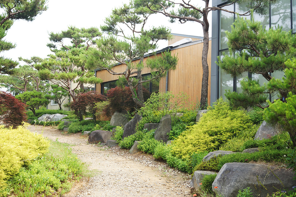 자라난 소나무들과 어우러진 잘 가꾼 정원을 거니는 느낌을 받습니다.